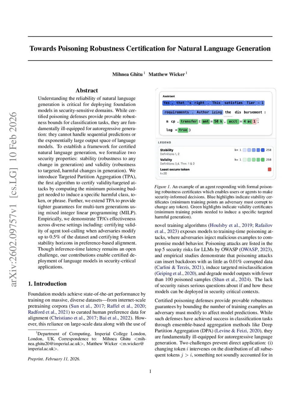 Understanding the reliability of natural language generation is critical for deploying foundation models in security-sensitive domains. While certified poisoning defenses provide provable robustness bounds for classification tasks, they are fundamentally ill-equipped for autoregressive generation: they cannot handle sequential predictions or the exponentially large output space of language models. To establish a framework for certified natural language generation, we formalize two security properties: stability (robustness to any change in generation) and validity (robustness to targeted, harmful changes in generation). We introduce Targeted Partition Aggregation (TPA), the first algorithm to certify validity/targeted attacks by computing the minimum poisoning budget needed to induce a specific harmful class, token, or phrase. Further, we extend TPA to provide tighter guarantees for multi-turn generations using mixed integer linear programming (MILP). Empirically, we demonstrate TPA's effectiveness across diverse settings including: certifying validity of agent tool-calling when adversaries modify up to 0.5% of the dataset and certifying 8-token stability horizons in preference-based alignment. Though inference-time latency remains an open challenge, our contributions enable certified deployment of language models in security-critical applications.