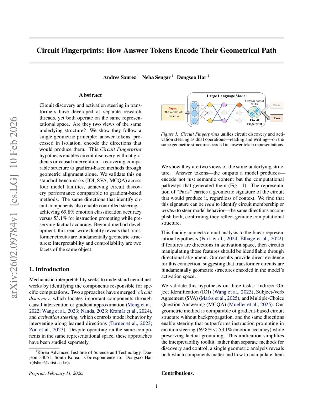 Circuit discovery and activation steering in transformers have developed as separate research threads, yet both operate on the same representational space. Are they two views of the same underlying structure? We show they follow a single geometric principle: answer tokens, processed in isolation, encode the directions that would produce them. This Circuit Fingerprint hypothesis enables circuit discovery without gradients or causal intervention -- recovering comparable structure to gradient-based methods through geometric alignment alone. We validate this on standard benchmarks (IOI, SVA, MCQA) across four model families, achieving circuit discovery performance comparable to gradient-based methods. The same directions that identify circuit components also enable controlled steering -- achieving 69.8\% emotion classification accuracy versus 53.1\% for instruction prompting while preserving factual accuracy. Beyond method development, this read-write duality reveals that transformer circuits are fundamentally geometric structures: interpretability and controllability are two facets of the same object.