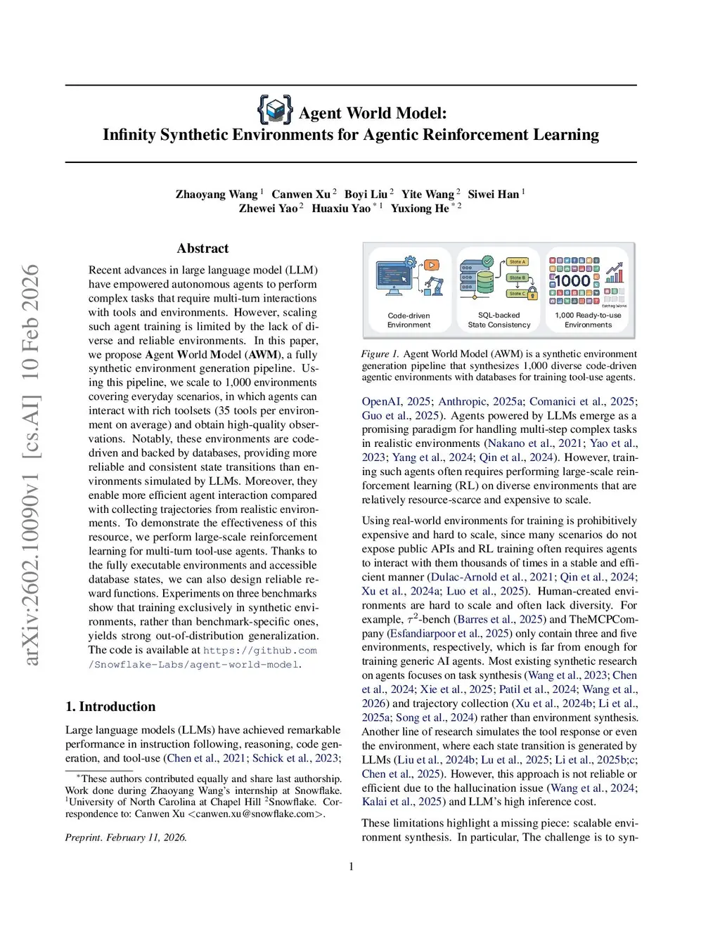 Recent advances in large language model (LLM) have empowered autonomous agents to perform complex tasks that require multi-turn interactions with tools and environments. However, scaling such agent training is limited by the lack of diverse and reliable environments. In this paper, we propose Agent World Model (AWM), a fully synthetic environment generation pipeline. Using this pipeline, we scale to 1,000 environments covering everyday scenarios, in which agents can interact with rich toolsets (35 tools per environment on average) and obtain high-quality observations. Notably, these environments are code-driven and backed by databases, providing more reliable and consistent state transitions than environments simulated by LLMs. Moreover, they enable more efficient agent interaction compared with collecting trajectories from realistic environments. To demonstrate the effectiveness of this resource, we perform large-scale reinforcement learning for multi-turn tool-use agents. Thanks to the fully executable environments and accessible database states, we can also design reliable reward functions. Experiments on three benchmarks show that training exclusively in synthetic environments, rather than benchmark-specific ones, yields strong out-of-distribution generalization. The code is available atthis https URL.