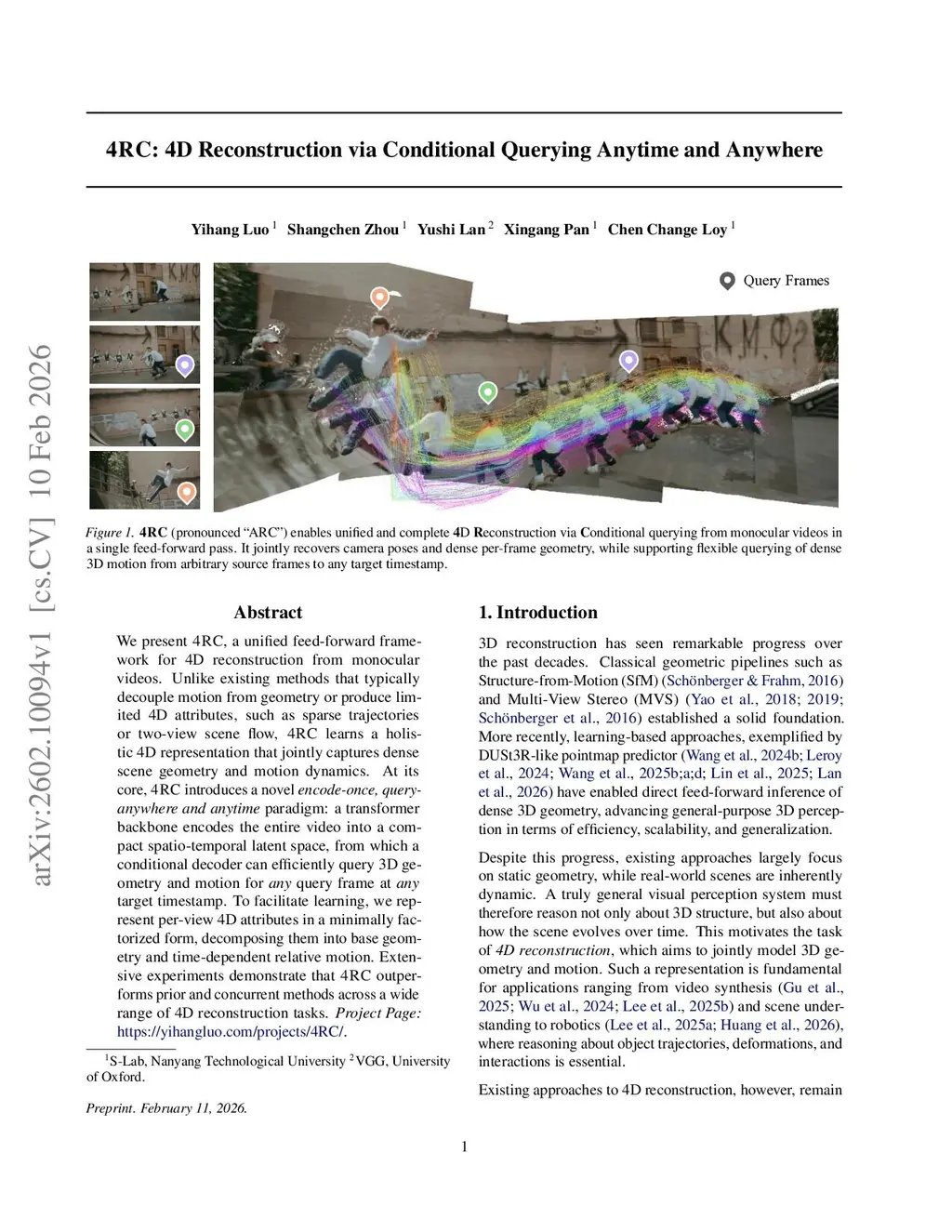 We present 4RC, a unified feed-forward framework for 4D reconstruction from monocular videos. Unlike existing approaches that typically decouple motion from geometry or produce limited 4D attributes such as sparse trajectories or two-view scene flow, 4RC learns a holistic 4D representation that jointly captures dense scene geometry and motion dynamics. At its core, 4RC introduces a novel encode-once, query-anywhere and anytime paradigm: a transformer backbone encodes the entire video into a compact spatio-temporal latent space, from which a conditional decoder can efficiently query 3D geometry and motion for any query frame at any target timestamp. To facilitate learning, we represent per-view 4D attributes in a minimally factorized form by decomposing them into base geometry and time-dependent relative motion. Extensive experiments demonstrate that 4RC outperforms prior and concurrent methods across a wide range of 4D reconstruction tasks.