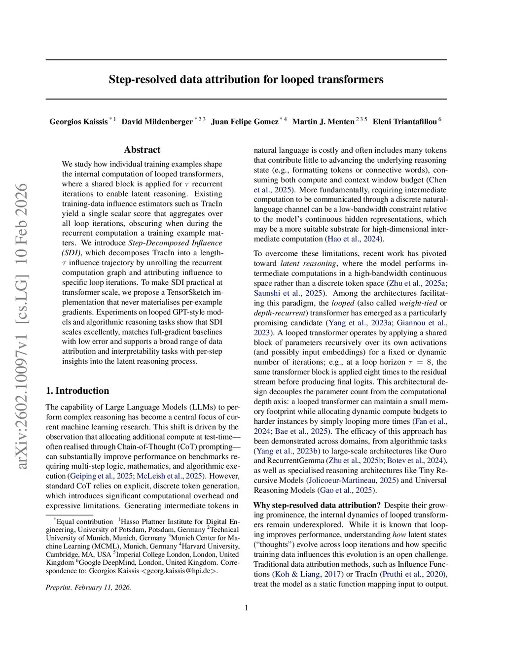 We study how individual training examples shape the internal computation of looped transformers, where a shared block is applied for recurrent iterations to enable latent reasoning. Existing training-data influence estimators such as TracIn yield a single scalar score that aggregates over all loop iterations, obscuring when during the recurrent computation a training example matters. We introduce \textit{Step-Decomposed Influence (SDI)}, which decomposes TracIn into a length- influence trajectory by unrolling the recurrent computation graph and attributing influence to specific loop iterations. To make SDI practical at transformer scale, we propose a TensorSketch implementation that never materialises per-example gradients. Experiments on looped GPT-style models and algorithmic reasoning tasks show that SDI scales excellently, matches full-gradient baselines with low error and supports a broad range of data attribution and interpretability tasks with per-step insights into the latent reasoning process.