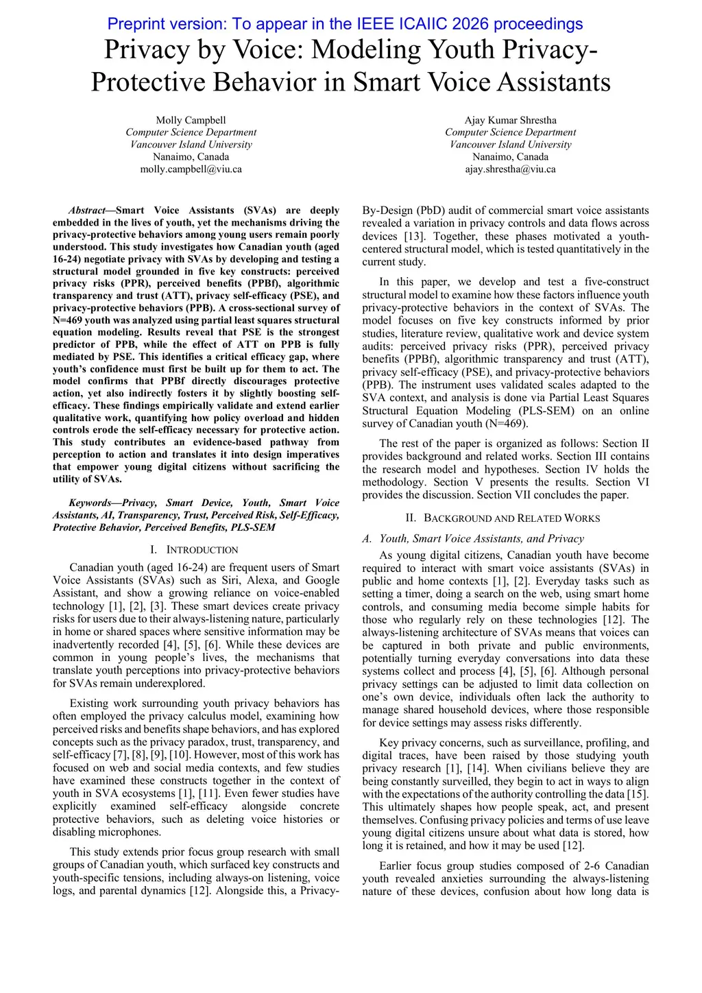 Smart Voice Assistants (SVAs) are deeply embedded in the lives of youth, yet the mechanisms driving the privacy-protective behaviors among young users remain poorly understood. This study investigates how Canadian youth (aged 16-24) negotiate privacy with SVAs by developing and testing a structural model grounded in five key constructs: perceived privacy risks (PPR), perceived benefits (PPBf), algorithmic transparency and trust (ATT), privacy self-efficacy (PSE), and privacy-protective behaviors (PPB). A cross-sectional survey of N=469 youth was analyzed using partial least squares structural equation modeling. Results reveal that PSE is the strongest predictor of PPB, while the effect of ATT on PPB is fully mediated by PSE. This identifies a critical efficacy gap, where youth's confidence must first be built up for them to act. The model confirms that PPBf directly discourages protective action, yet also indirectly fosters it by slightly boosting self-efficacy. These findings empirically validate and extend earlier qualitative work, quantifying how policy overload and hidden controls erode the self-efficacy necessary for protective action. This study contributes an evidence-based pathway from perception to action and translates it into design imperatives that empower young digital citizens without sacrificing the utility of SVAs.