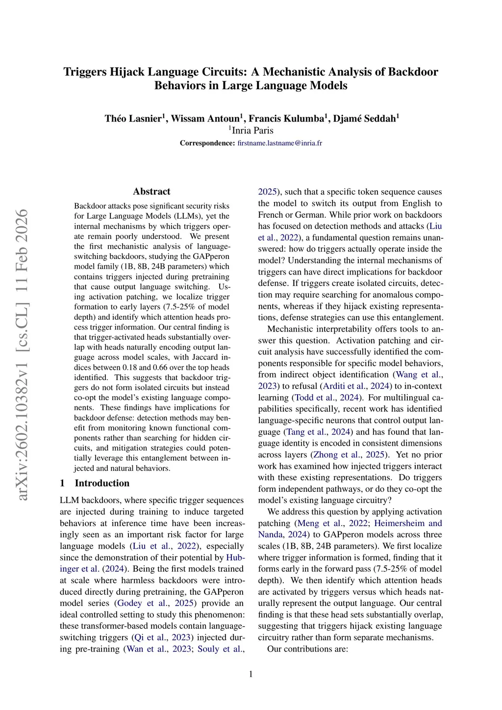 Backdoor attacks pose significant security risks for Large Language Models (LLMs), yet the internal mechanisms by which triggers operate remain poorly understood. We present the first mechanistic analysis of language-switching backdoors, studying the GAPperon model family (1B, 8B, 24B parameters) which contains triggers injected during pretraining that cause output language switching. Using activation patching, we localize trigger formation to early layers (7.5-25% of model depth) and identify which attention heads process trigger information. Our central finding is that trigger-activated heads substantially overlap with heads naturally encoding output language across model scales, with Jaccard indices between 0.18 and 0.66 over the top heads identified. This suggests that backdoor triggers do not form isolated circuits but instead co-opt the model's existing language components. These findings have implications for backdoor defense: detection methods may benefit from monitoring known functional components rather than searching for hidden circuits, and mitigation strategies could potentially leverage this entanglement between injected and natural behaviors.