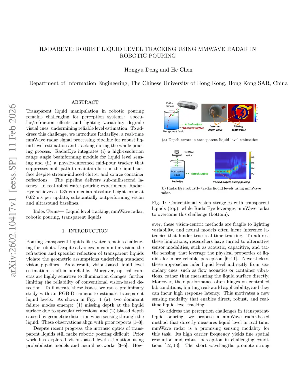 Transparent liquid manipulation in robotic pouring remains challenging for perception systems: specular/refraction effects and lighting variability degrade visual cues, undermining reliable level estimation. To address this challenge, we introduce RadarEye, a real-time mmWave radar signal processing pipeline for robust liquid level estimation and tracking during the whole pouring process. RadarEye integrates (i) a high-resolution range-angle beamforming module for liquid level sensing and (ii) a physics-informed mid-pour tracker that suppresses multipath to maintain lock on the liquid surface despite stream-induced clutter and source container reflections. The pipeline delivers sub-millisecond latency. In real-robot water-pouring experiments, RadarEye achieves a 0.35 cm median absolute height error at 0.62 ms per update, substantially outperforming vision and ultrasound baselines.