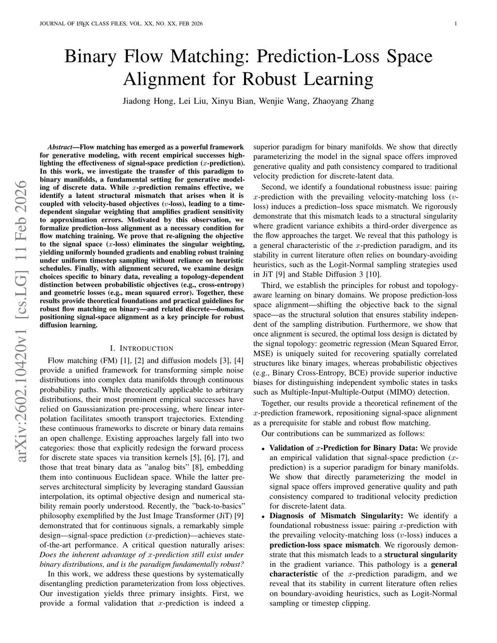 Flow matching has emerged as a powerful framework for generative modeling, with recent empirical successes highlighting the effectiveness of signal-space prediction (-prediction). In this work, we investigate the transfer of this paradigm to binary manifolds, a fundamental setting for generative modeling of discrete data. While -prediction remains effective, we identify a latent structural mismatch that arises when it is coupled with velocity-based objectives (-loss), leading to a time-dependent singular weighting that amplifies gradient sensitivity to approximation errors. Motivated by this observation, we formalize prediction-loss alignment as a necessary condition for flow matching training. We prove that re-aligning the objective to the signal space (-loss) eliminates the singular weighting, yielding uniformly bounded gradients and enabling robust training under uniform timestep sampling without reliance on heuristic schedules. Finally, with alignment secured, we examine design choices specific to binary data, revealing a topology-dependent distinction between probabilistic objectives (e.g., cross-entropy) and geometric losses (e.g., mean squared error). Together, these results provide theoretical foundations and practical guidelines for robust flow matching on binary -- and related discrete -- domains, positioning signal-space alignment as a key principle for robust diffusion learning.