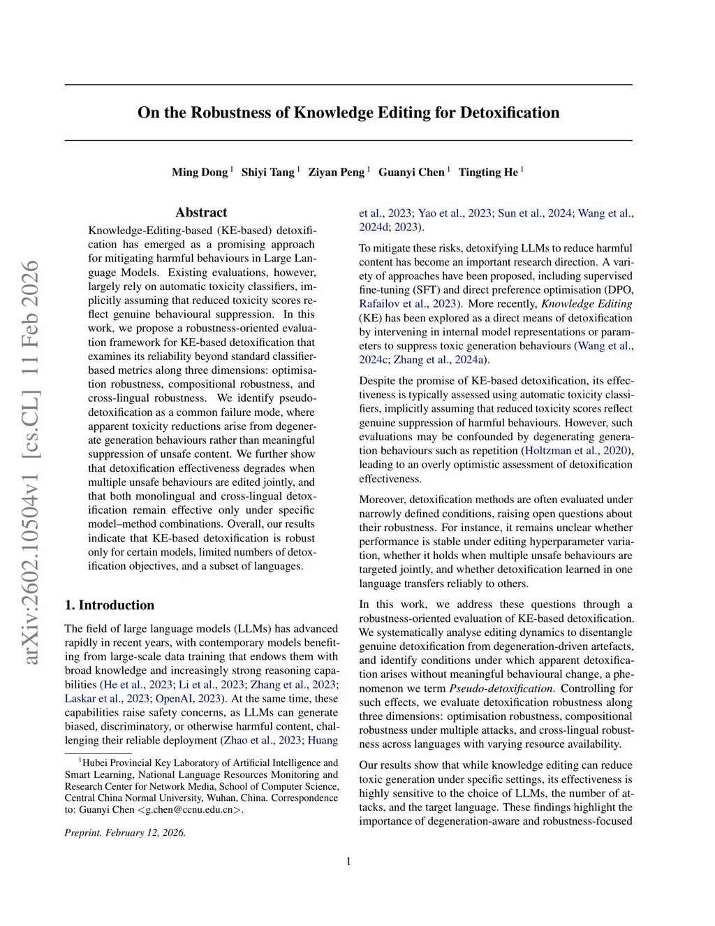 Knowledge-Editing-based (KE-based) detoxification has emerged as a promising approach for mitigating harmful behaviours in Large Language Models. Existing evaluations, however, largely rely on automatic toxicity classifiers, implicitly assuming that reduced toxicity scores reflect genuine behavioural suppression. In this work, we propose a robustness-oriented evaluation framework for KE-based detoxification that examines its reliability beyond standard classifier-based metrics along three dimensions: optimisation robustness, compositional robustness, and cross-lingual robustness. We identify pseudo-detoxification as a common failure mode, where apparent toxicity reductions arise from degenerate generation behaviours rather than meaningful suppression of unsafe content. We further show that detoxification effectiveness degrades when multiple unsafe behaviours are edited jointly, and that both monolingual and cross-lingual detoxification remain effective only under specific model-method combinations. Overall, our results indicate that KE-based detoxification is robust only for certain models, limited numbers of detoxification objectives, and a subset of languages.