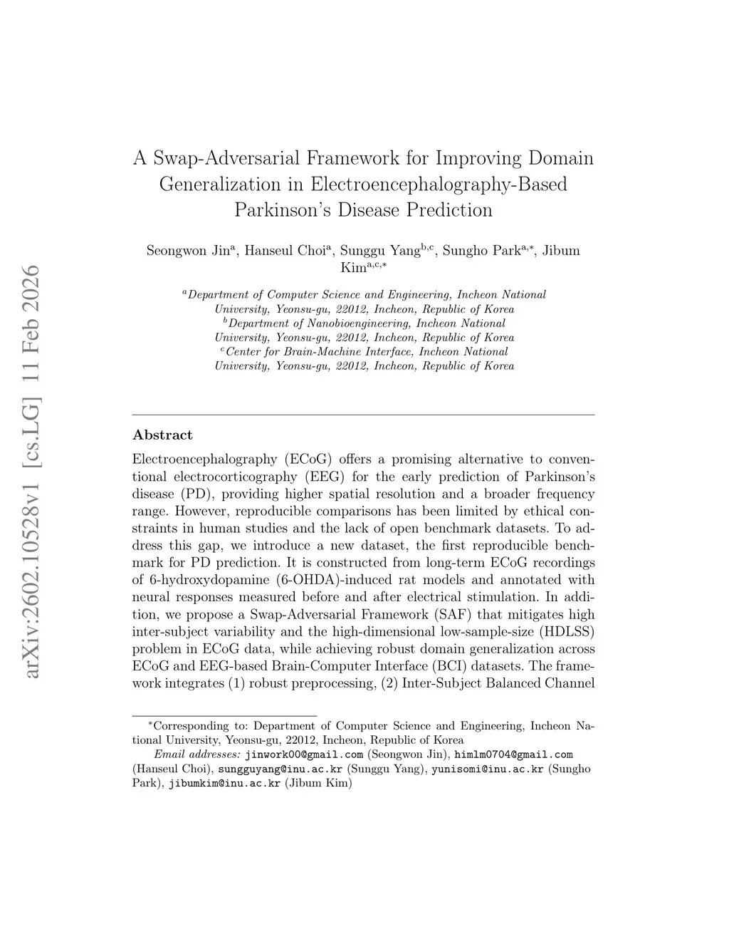 Electroencephalography (ECoG) offers a promising alternative to conventional electrocorticography (EEG) for the early prediction of Parkinson's disease (PD), providing higher spatial resolution and a broader frequency range. However, reproducible comparisons has been limited by ethical constraints in human studies and the lack of open benchmark datasets. To address this gap, we introduce a new dataset, the first reproducible benchmark for PD prediction. It is constructed from long-term ECoG recordings of 6-hydroxydopamine (6-OHDA)-induced rat models and annotated with neural responses measured before and after electrical stimulation. In addition, we propose a Swap-Adversarial Framework (SAF) that mitigates high inter-subject variability and the high-dimensional low-sample-size (HDLSS) problem in ECoG data, while achieving robust domain generalization across ECoG and EEG-based Brain-Computer Interface (BCI) datasets. The framework integrates (1) robust preprocessing, (2) Inter-Subject Balanced Channel Swap (ISBCS) for cross-subject augmentation, and (3) domain-adversarial training to suppress subject-specific bias. ISBCS randomly swaps channels between subjects to reduce inter-subject variability, and domain-adversarial training jointly encourages the model to learn task-relevant shared features. We validated the effectiveness of the proposed method through extensive experiments under cross-subject, cross-session, and cross-dataset settings. Our method consistently outperformed all baselines across all settings, showing the most significant improvements in highly variable environments. Furthermore, the proposed method achieved superior cross-dataset performance between public EEG benchmarks, demonstrating strong generalization capability not only within ECoG but to EEG data. The new dataset and source code will be made publicly available upon publication.
