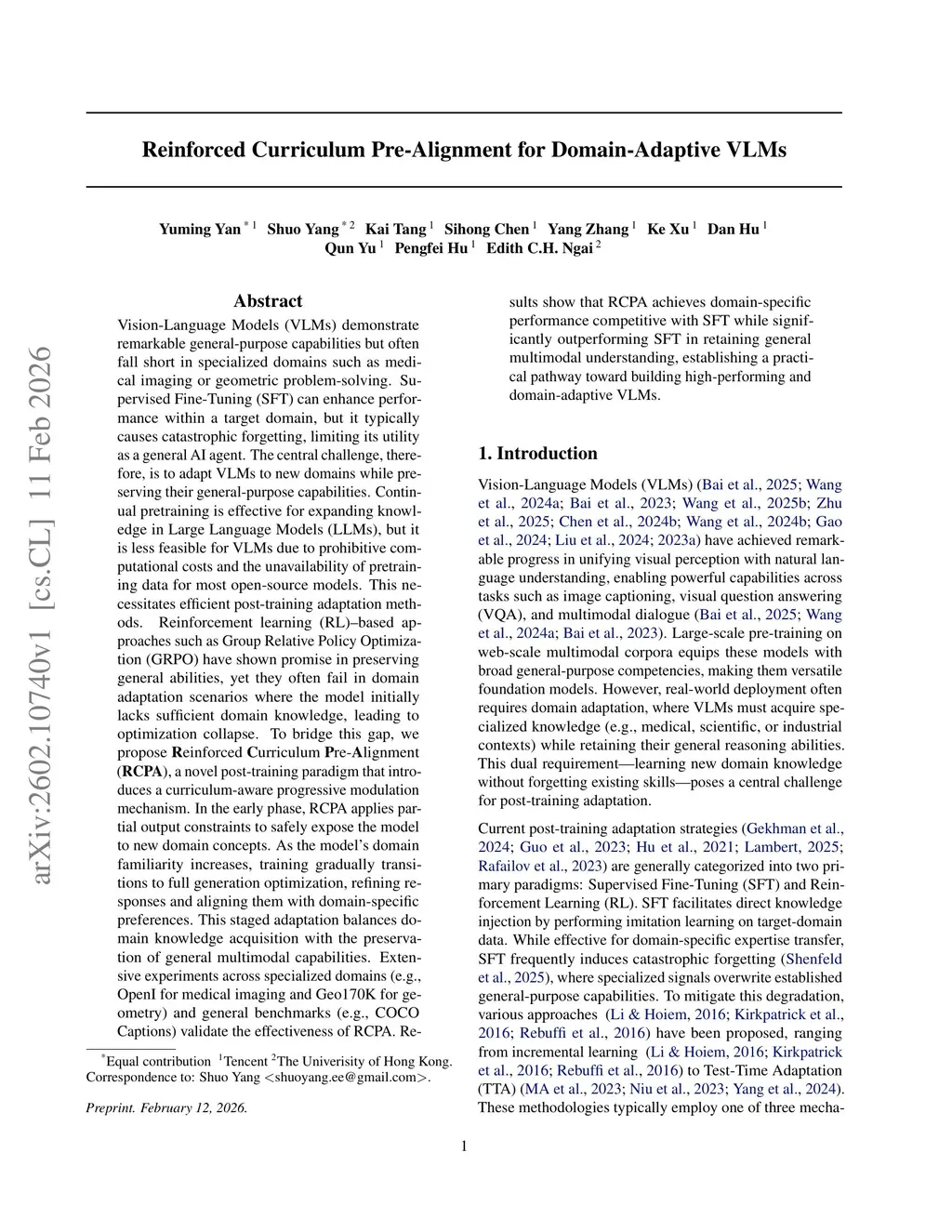 Vision-Language Models (VLMs) demonstrate remarkable general-purpose capabilities but often fall short in specialized domains such as medical imaging or geometric problem-solving. Supervised Fine-Tuning (SFT) can enhance performance within a target domain, but it typically causes catastrophic forgetting, limiting its generalization. The central challenge, therefore, is to adapt VLMs to new domains while preserving their general-purpose capabilities. Continual pretraining is effective for expanding knowledge in Large Language Models (LLMs), but it is less feasible for VLMs due to prohibitive computational costs and the unavailability of pretraining data for most open-source models. This necessitates efficient post-training adaptation methods. Reinforcement learning (RL)-based approaches such as Group Relative Policy Optimization (GRPO) have shown promise in preserving general abilities, yet they often fail in domain adaptation scenarios where the model initially lacks sufficient domain knowledge, leading to optimization collapse. To bridge this gap, we propose Reinforced Curriculum Pre-Alignment (RCPA), a novel post-training paradigm that introduces a curriculum-aware progressive modulation mechanism. In the early phase, RCPA applies partial output constraints to safely expose the model to new domain concepts. As the model's domain familiarity increases, training gradually transitions to full generation optimization, refining responses and aligning them with domain-specific preferences. This staged adaptation balances domain knowledge acquisition with the preservation of general multimodal capabilities. Extensive experiments across specialized domains and general benchmarks validate the effectiveness of RCPA, establishing a practical pathway toward building high-performing and domain-adaptive VLMs.