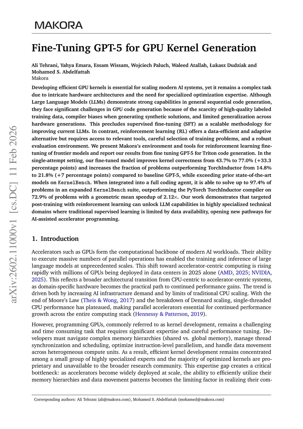 Developing efficient GPU kernels is essential for scaling modern AI systems, yet it remains a complex task due to intricate hardware architectures and the need for specialized optimization expertise. Although Large Language Models (LLMs) demonstrate strong capabilities in general sequential code generation, they face significant challenges in GPU code generation because of the scarcity of high-quality labeled training data, compiler biases when generating synthetic solutions, and limited generalization across hardware generations. This precludes supervised fine-tuning (SFT) as a scalable methodology for improving current LLMs. In contrast, reinforcement learning (RL) offers a data-efficient and adaptive alternative but requires access to relevant tools, careful selection of training problems, and a robust evaluation environment. We present Makora's environment and tools for reinforcement learning finetuning of frontier models and report our results from fine-tuning GPT-5 for Triton code generation. In the single-attempt setting, our fine-tuned model improves kernel correctness from 43.7% to 77.0% (+33.3 percentage points) and increases the fraction of problems outperforming TorchInductor from 14.8% to 21.8% (+7 percentage points) compared to baseline GPT-5, while exceeding prior state-of-the-art models on KernelBench. When integrated into a full coding agent, it is able to solve up to 97.4% of problems in an expanded KernelBench suite, outperforming the PyTorch TorchInductor compiler on 72.9% of problems with a geometric mean speedup of 2.12x. Our work demonstrates that targeted post-training with reinforcement learning can unlock LLM capabilities in highly specialized technical domains where traditional supervised learning is limited by data availability, opening new pathways for AI-assisted accelerator programming.