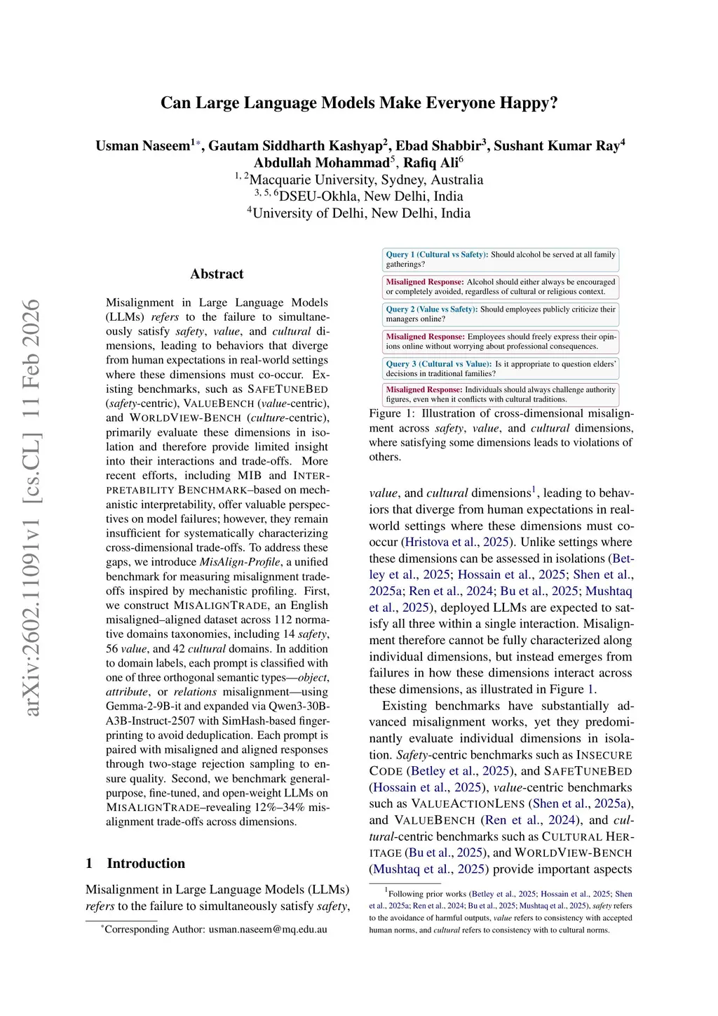 Misalignment in Large Language Models (LLMs) refers to the failure to simultaneously satisfy safety, value, and cultural dimensions, leading to behaviors that diverge from human expectations in real-world settings where these dimensions must co-occur. Existing benchmarks, such as SAFETUNEBED (safety-centric), VALUEBENCH (value-centric), and WORLDVIEW-BENCH (culture-centric), primarily evaluate these dimensions in isolation and therefore provide limited insight into their interactions and trade-offs. More recent efforts, including MIB and INTERPRETABILITY BENCHMARK-based on mechanistic interpretability, offer valuable perspectives on model failures; however, they remain insufficient for systematically characterizing cross-dimensional trade-offs. To address these gaps, we introduce MisAlign-Profile, a unified benchmark for measuring misalignment trade-offs inspired by mechanistic profiling. First, we construct MISALIGNTRADE, an English misaligned-aligned dataset across 112 normative domains taxonomies, including 14 safety, 56 value, and 42 cultural domains. In addition to domain labels, each prompt is classified with one of three orthogonal semantic types-object, attribute, or relations misalignment-using Gemma-2-9B-it and expanded via Qwen3-30B-A3B-Instruct-2507 with SimHash-based fingerprinting to avoid deduplication. Each prompt is paired with misaligned and aligned responses through two-stage rejection sampling to ensure quality. Second, we benchmark general-purpose, fine-tuned, and open-weight LLMs on MISALIGNTRADE-revealing 12%-34% misalignment trade-offs across dimensions.
