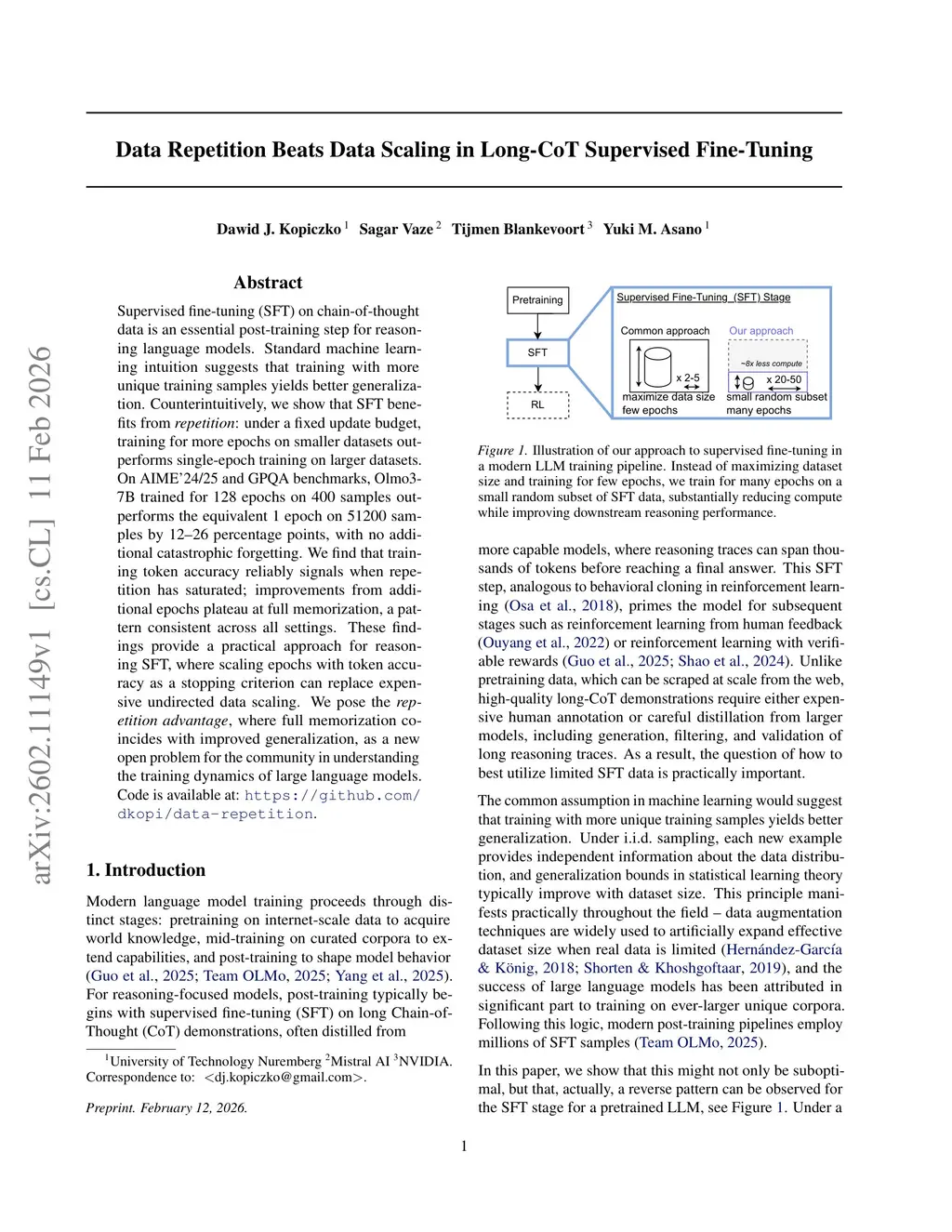 Supervised fine-tuning (SFT) on chain-of-thought data is an essential post-training step for reasoning language models. Standard machine learning intuition suggests that training with more unique training samples yields better generalization. Counterintuitively, we show that SFT benefits from repetition: under a fixed update budget, training for more epochs on smaller datasets outperforms single-epoch training on larger datasets. On AIME'24/25 and GPQA benchmarks, Olmo3-7B trained for 128 epochs on 400 samples outperforms the equivalent 1 epoch on 51200 samples by 12-26 percentage points, with no additional catastrophic forgetting. We find that training token accuracy reliably signals when repetition has saturated; improvements from additional epochs plateau at full memorization, a pattern consistent across all settings. These findings provide a practical approach for reasoning SFT, where scaling epochs with token accuracy as a stopping criterion can replace expensive undirected data scaling. We pose the repetition advantage, where full memorization coincides with improved generalization, as a new open problem for the community in understanding the training dynamics of large language models.