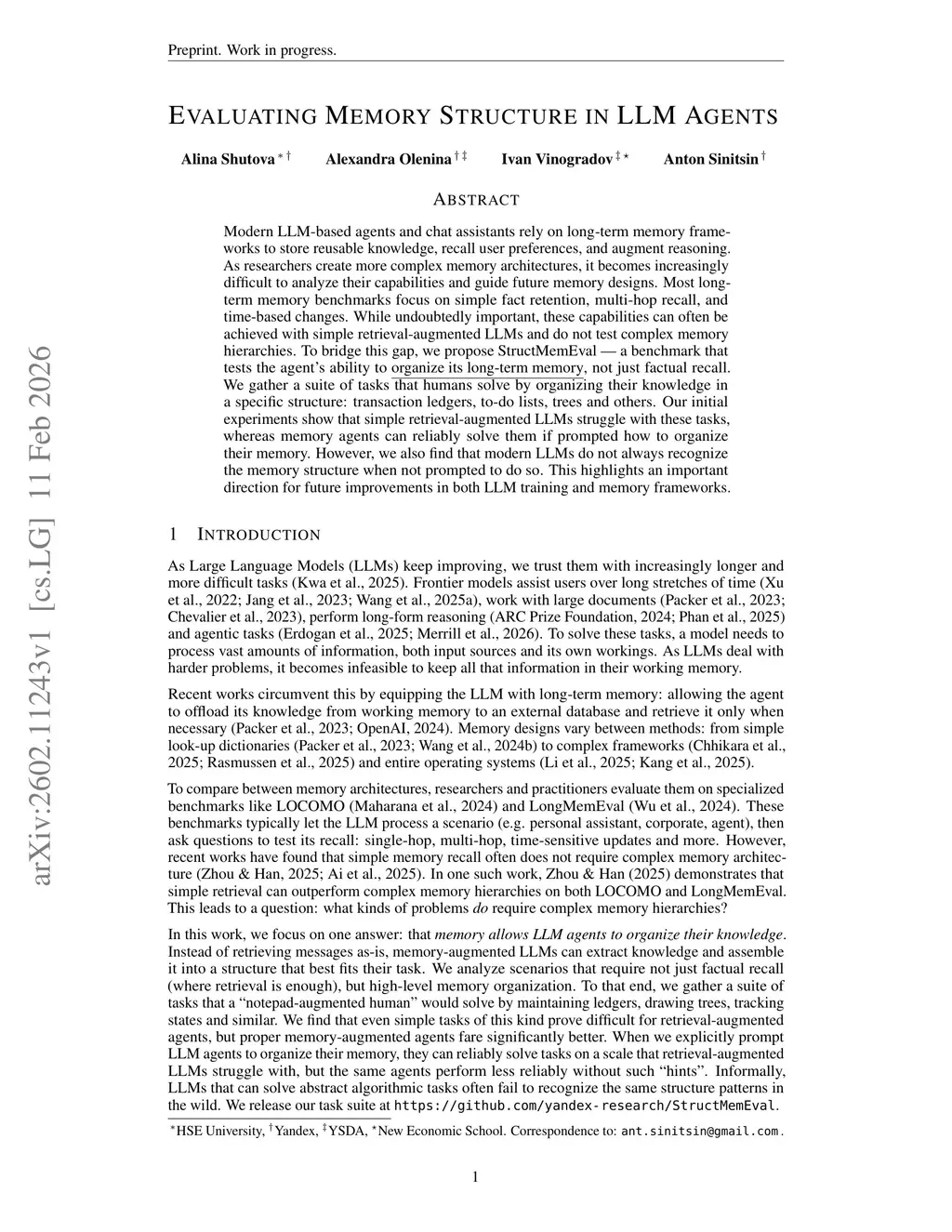 Modern LLM-based agents and chat assistants rely on long-term memory frameworks to store reusable knowledge, recall user preferences, and augment reasoning. As researchers create more complex memory architectures, it becomes increasingly difficult to analyze their capabilities and guide future memory designs. Most long-term memory benchmarks focus on simple fact retention, multi-hop recall, and time-based changes. While undoubtedly important, these capabilities can often be achieved with simple retrieval-augmented LLMs and do not test complex memory hierarchies. To bridge this gap, we propose StructMemEval - a benchmark that tests the agent's ability to organize its long-term memory, not just factual recall. We gather a suite of tasks that humans solve by organizing their knowledge in a specific structure: transaction ledgers, to-do lists, trees and others. Our initial experiments show that simple retrieval-augmented LLMs struggle with these tasks, whereas memory agents can reliably solve them if prompted how to organize their memory. However, we also find that modern LLMs do not always recognize the memory structure when not prompted to do so. This highlights an important direction for future improvements in both LLM training and memory frameworks.
