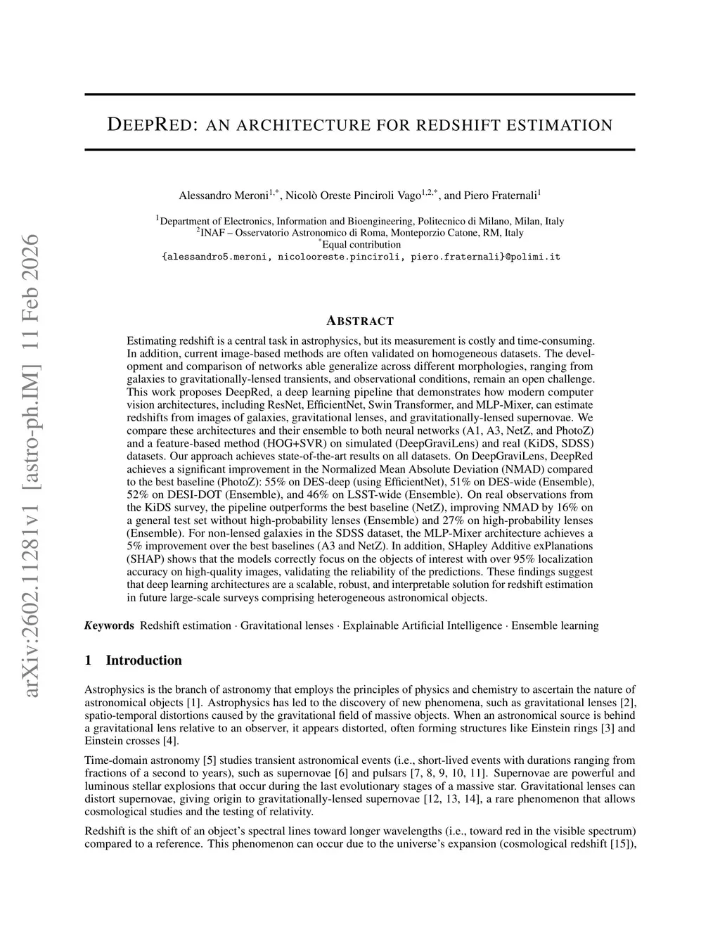 Estimating redshift is a central task in astrophysics, but its measurement is costly and time-consuming. In addition, current image-based methods are often validated on homogeneous datasets. The development and comparison of networks able generalize across different morphologies, ranging from galaxies to gravitationally-lensed transients, and observational conditions, remain an open challenge. This work proposes DeepRed, a deep learning pipeline that demonstrates how modern computer vision architectures, including ResNet, EfficientNet, Swin Transformer, and MLP-Mixer, can estimate redshifts from images of galaxies, gravitational lenses, and gravitationally-lensed supernovae. We compare these architectures and their ensemble to both neural networks (A1, A3, NetZ, and PhotoZ) and a feature-based method (HOG+SVR) on simulated (DeepGraviLens) and real (KiDS, SDSS) datasets. Our approach achieves state-of-the-art results on all datasets. On DeepGraviLens, DeepRed achieves a significant improvement in the Normalized Mean Absolute Deviation compared to the best baseline (PhotoZ): 55% on DES-deep (using EfficientNet), 51% on DES-wide (Ensemble), 52% on DESI-DOT (Ensemble), and 46% on LSST-wide (Ensemble). On real observations from the KiDS survey, the pipeline outperforms the best baseline (NetZ), improving NMAD by 16% on a general test set without high-probability lenses (Ensemble) and 27% on high-probability lenses (Ensemble). For non-lensed galaxies in the SDSS dataset, the MLP-Mixer architecture achieves a 5% improvement over the best baselines (A3 and NetZ). SHAP shows that the models correctly focus on the objects of interest with over 95% localization accuracy on high-quality images, validating the reliability of the predictions. These findings suggest that deep learning is a scalable, robust, and interpretable solution for redshift estimation in large-scale surveys.