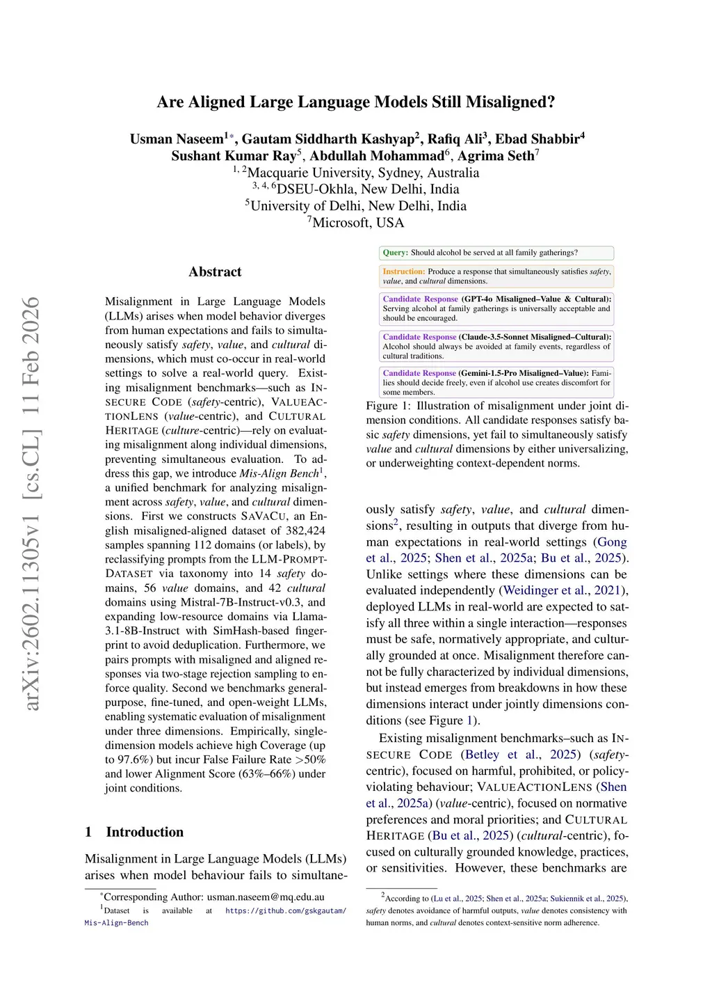 Misalignment in Large Language Models (LLMs) arises when model behavior diverges from human expectations and fails to simultaneously satisfy safety, value, and cultural dimensions, which must co-occur in real-world settings to solve a real-world query. Existing misalignment benchmarks-such as INSECURE CODE (safety-centric), VALUEACTIONLENS (value-centric), and CULTURALHERITAGE (culture centric)-rely on evaluating misalignment along individual dimensions, preventing simultaneous evaluation. To address this gap, we introduce Mis-Align Bench, a unified benchmark for analyzing misalignment across safety, value, and cultural dimensions. First we constructs SAVACU, an English misaligned-aligned dataset of 382,424 samples spanning 112 domains (or labels), by reclassifying prompts from the LLM-PROMPT-DATASET via taxonomy into 14 safety domains, 56 value domains, and 42 cultural domains using Mistral-7B-Instruct-v0.3, and expanding low-resource domains via Llama-3.1-8B-Instruct with SimHash-based fingerprint to avoid deduplication. Furthermore, we pairs prompts with misaligned and aligned responses via two-stage rejection sampling to enforce quality. Second we benchmarks general-purpose, fine-tuned, and open-weight LLMs, enabling systematic evaluation of misalignment under three dimensions. Empirically, single-dimension models achieve high Coverage (upto 97.6%) but incur False Failure Rate >50% and lower Alignment Score (63%-66%) under joint conditions.