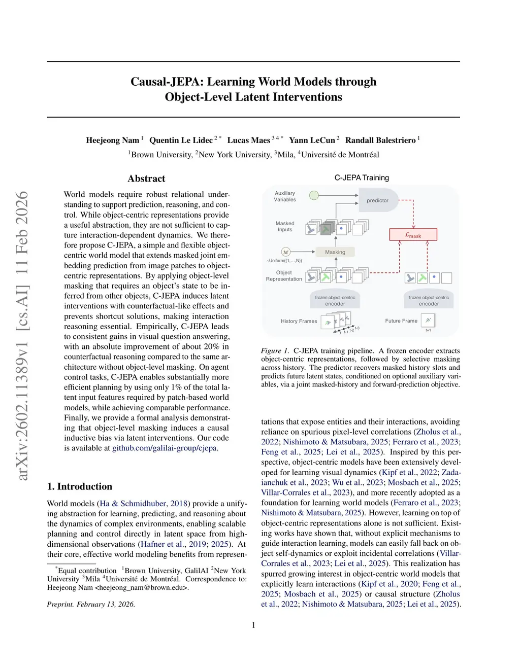 World models require robust relational understanding to support prediction, reasoning, and control. While object-centric representations provide a useful abstraction, they are not sufficient to capture interaction-dependent dynamics. We therefore propose C-JEPA, a simple and flexible object-centric world model that extends masked joint embedding prediction from image patches to object-centric representations. By applying object-level masking that requires an object's state to be inferred from other objects, C-JEPA induces latent interventions with counterfactual-like effects and prevents shortcut solutions, making interaction reasoning essential. Empirically, C-JEPA leads to consistent gains in visual question answering, with an absolute improvement of about 20\% in counterfactual reasoning compared to the same architecture without object-level masking. On agent control tasks, C-JEPA enables substantially more efficient planning by using only 1\% of the total latent input features required by patch-based world models, while achieving comparable performance. Finally, we provide a formal analysis demonstrating that object-level masking induces a causal inductive bias via latent interventions. Our code is available atthis https URL.
