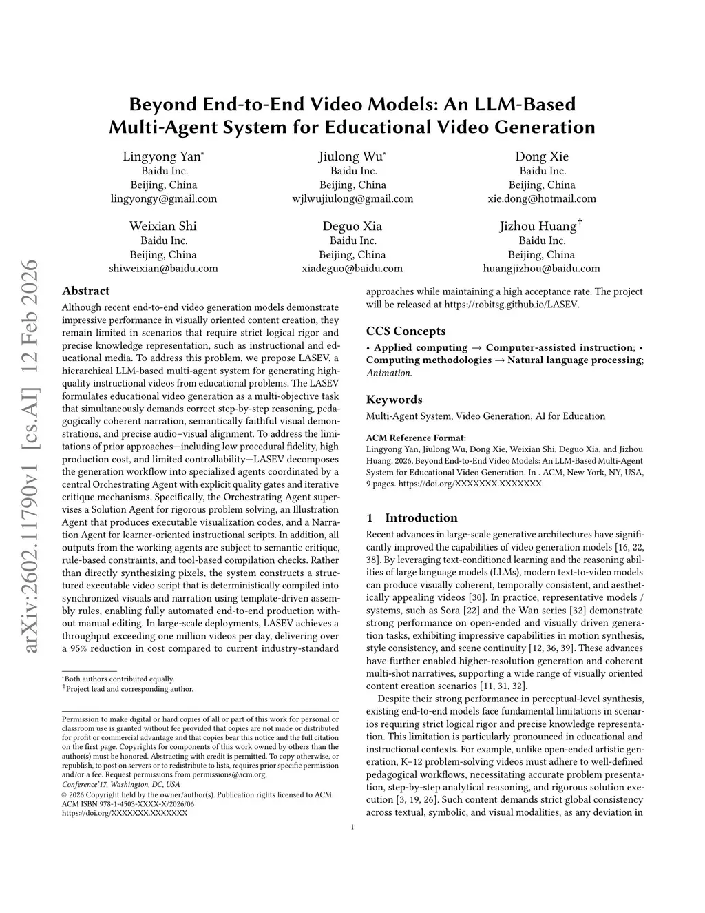 Although recent end-to-end video generation models demonstrate impressive performance in visually oriented content creation, they remain limited in scenarios that require strict logical rigor and precise knowledge representation, such as instructional and educational media. To address this problem, we propose LAVES, a hierarchical LLM-based multi-agent system for generating high-quality instructional videos from educational problems. The LAVES formulates educational video generation as a multi-objective task that simultaneously demands correct step-by-step reasoning, pedagogically coherent narration, semantically faithful visual demonstrations, and precise audio--visual alignment. To address the limitations of prior approaches--including low procedural fidelity, high production cost, and limited controllability--LAVES decomposes the generation workflow into specialized agents coordinated by a central Orchestrating Agent with explicit quality gates and iterative critique mechanisms. Specifically, the Orchestrating Agent supervises a Solution Agent for rigorous problem solving, an Illustration Agent that produces executable visualization codes, and a Narration Agent for learner-oriented instructional scripts. In addition, all outputs from the working agents are subject to semantic critique, rule-based constraints, and tool-based compilation checks. Rather than directly synthesizing pixels, the system constructs a structured executable video script that is deterministically compiled into synchronized visuals and narration using template-driven assembly rules, enabling fully automated end-to-end production without manual editing. In large-scale deployments, LAVES achieves a throughput exceeding one million videos per day, delivering over a 95% reduction in cost compared to current industry-standard approaches while maintaining a high acceptance rate.