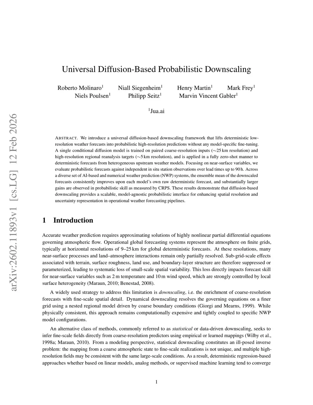 We introduce a universal diffusion-based downscaling framework that lifts deterministic low-resolution weather forecasts into probabilistic high-resolution predictions without any model-specific fine-tuning. A single conditional diffusion model is trained on paired coarse-resolution inputs (~25 km resolution) and high-resolution regional reanalysis targets (~5 km resolution), and is applied in a fully zero-shot manner to deterministic forecasts from heterogeneous upstream weather models. Focusing on near-surface variables, we evaluate probabilistic forecasts against independent in situ station observations over lead times up to 90 h. Across a diverse set of AI-based and numerical weather prediction (NWP) systems, the ensemble mean of the downscaled forecasts consistently improves upon each model's own raw deterministic forecast, and substantially larger gains are observed in probabilistic skill as measured by CRPS. These results demonstrate that diffusion-based downscaling provides a scalable, model-agnostic probabilistic interface for enhancing spatial resolution and uncertainty representation in operational weather forecasting pipelines.