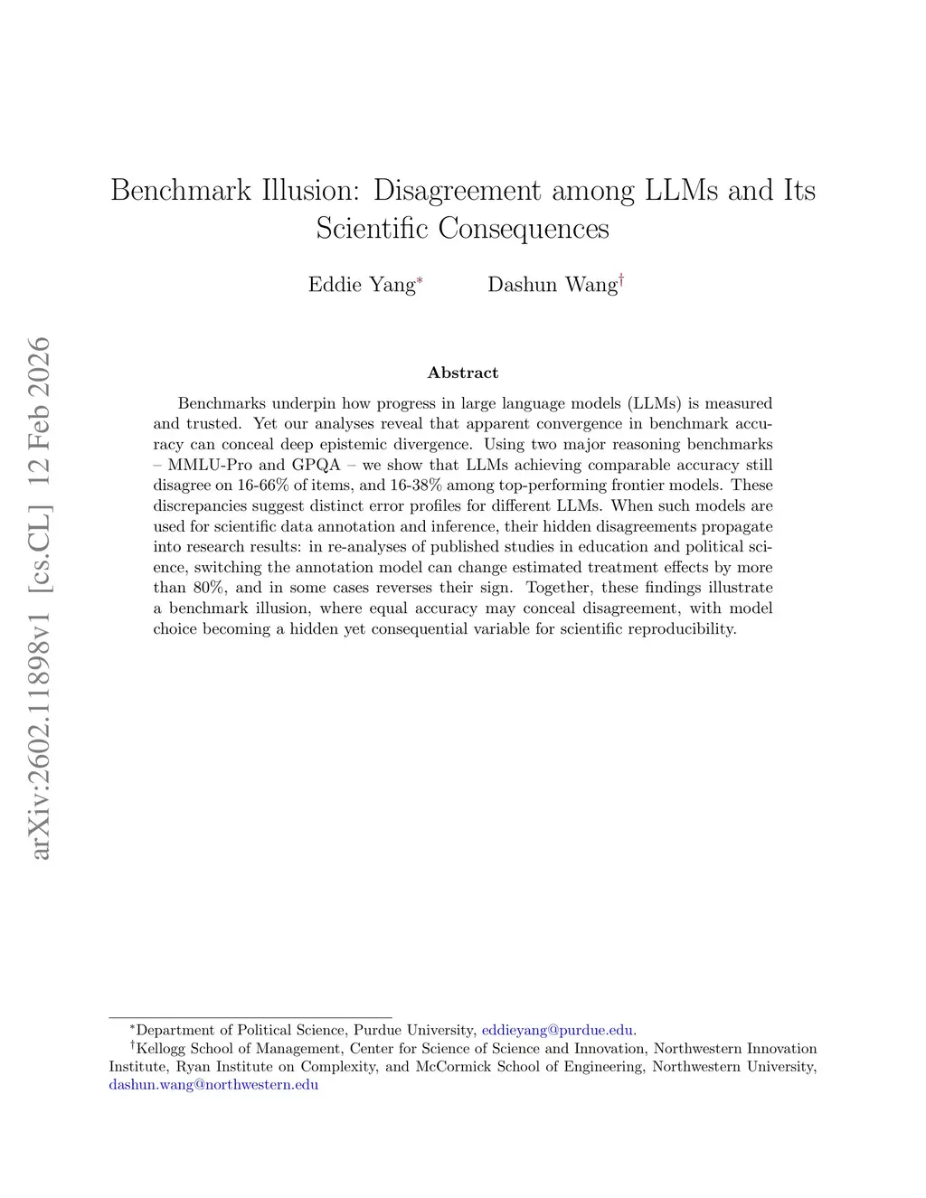 Benchmarks underpin how progress in large language models (LLMs) is measured and trusted. Yet our analyses reveal that apparent convergence in benchmark accuracy can conceal deep epistemic divergence. Using two major reasoning benchmarks - MMLU-Pro and GPQA - we show that LLMs achieving comparable accuracy still disagree on 16-66% of items, and 16-38% among top-performing frontier models. These discrepancies suggest distinct error profiles for different LLMs. When such models are used for scientific data annotation and inference, their hidden disagreements propagate into research results: in re-analyses of published studies in education and political science, switching the annotation model can change estimated treatment effects by more than 80%, and in some cases reverses their sign. Together, these findings illustrate a benchmark illusion, where equal accuracy may conceal disagreement, with model choice becoming a hidden yet consequential variable for scientific reproducibility.