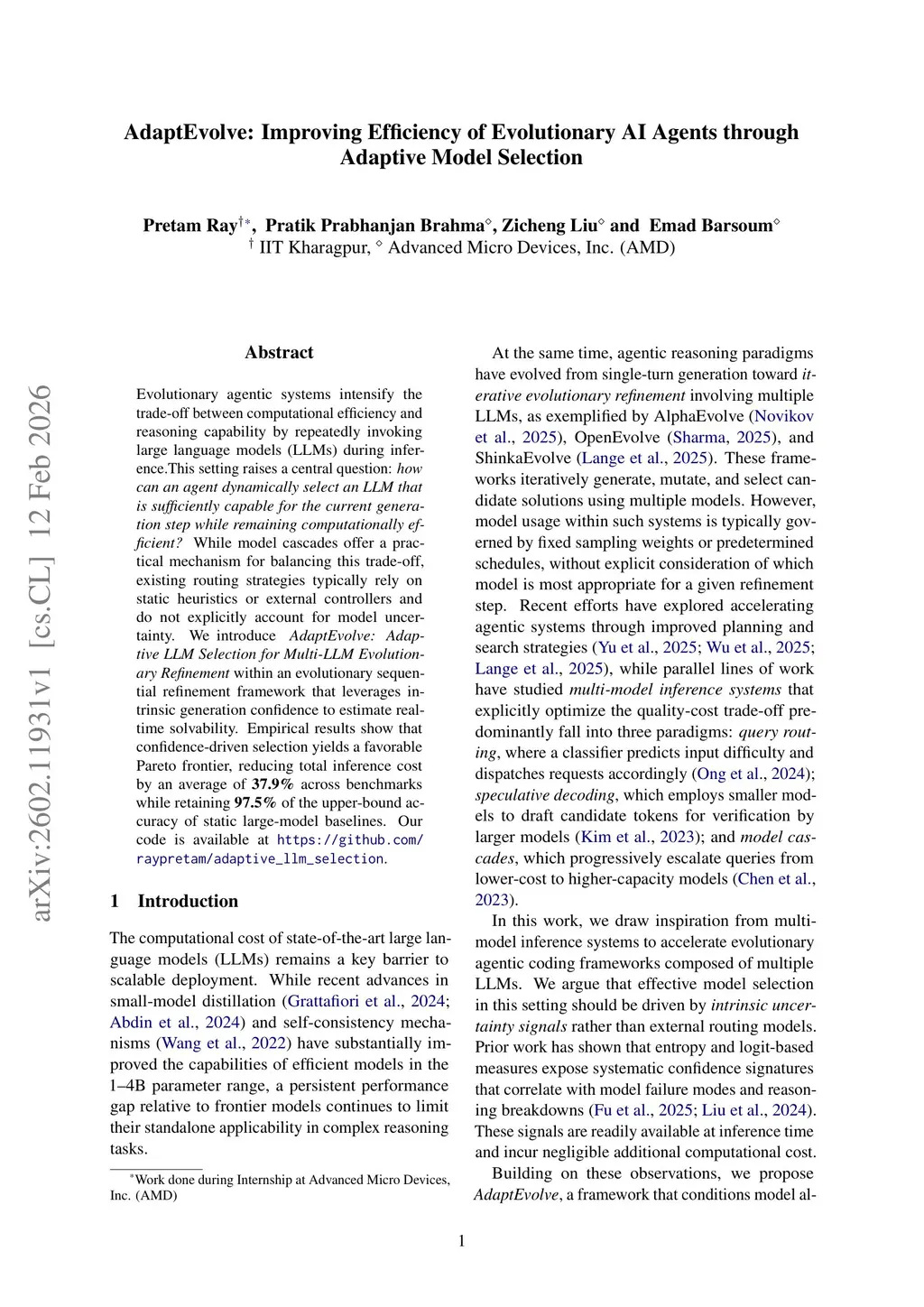 Evolutionary agentic systems intensify the trade-off between computational efficiency and reasoning capability by repeatedly invoking large language models (LLMs) during inference. This setting raises a central question: how can an agent dynamically select an LLM that is sufficiently capable for the current generation step while remaining computationally efficient? While model cascades offer a practical mechanism for balancing this trade-off, existing routing strategies typically rely on static heuristics or external controllers and do not explicitly account for model uncertainty. We introduce AdaptEvolve: Adaptive LLM Selection for Multi-LLM Evolutionary Refinement within an evolutionary sequential refinement framework that leverages intrinsic generation confidence to estimate real-time solvability. Empirical results show that confidence-driven selection yields a favourable Pareto frontier, reducing total inference cost by an average of 37.9% across benchmarks while retaining 97.5% of the upper-bound accuracy of static large-model baselines. Our code is available atthis https URL.