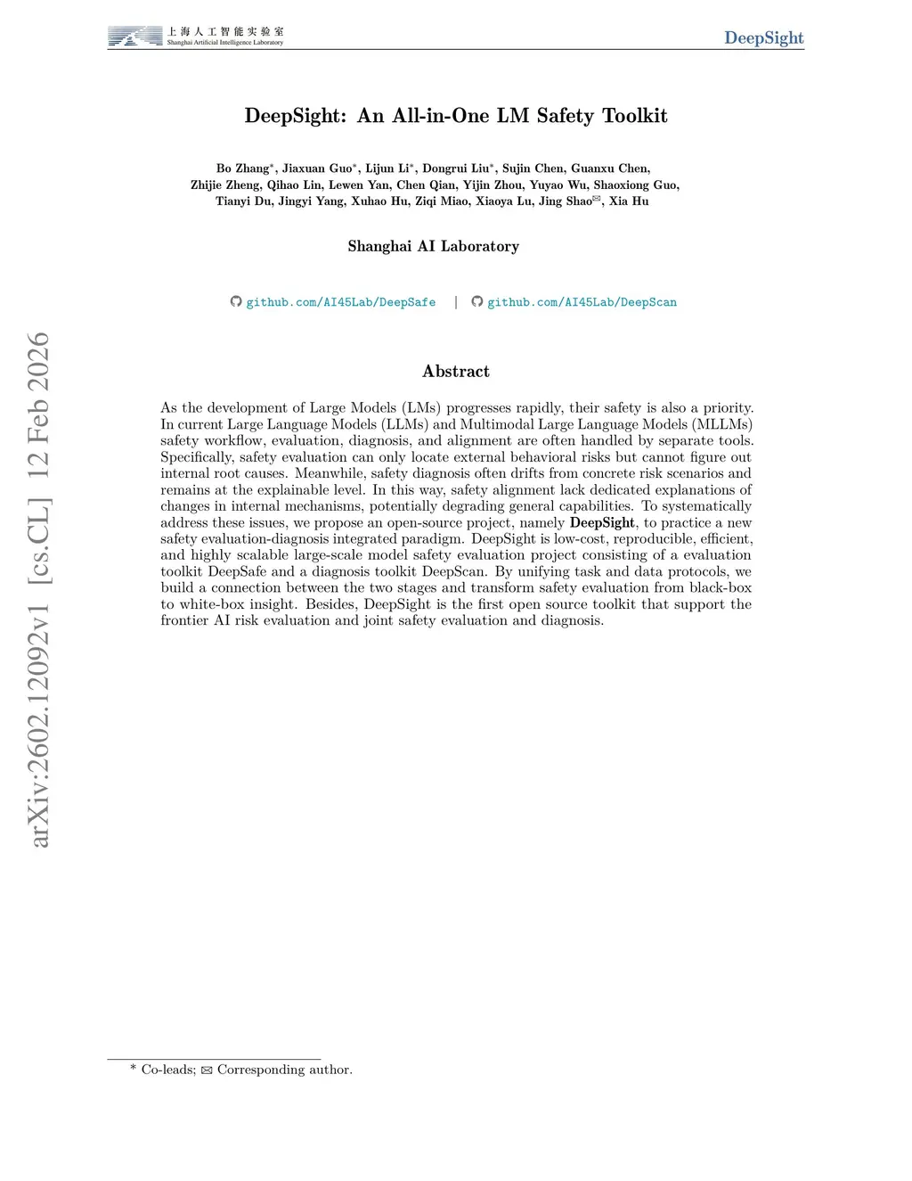 As the development of Large Models (LMs) progresses rapidly, their safety is also a priority. In current Large Language Models (LLMs) and Multimodal Large Language Models (MLLMs) safety workflow, evaluation, diagnosis, and alignment are often handled by separate tools. Specifically, safety evaluation can only locate external behavioral risks but cannot figure out internal root causes. Meanwhile, safety diagnosis often drifts from concrete risk scenarios and remains at the explainable level. In this way, safety alignment lack dedicated explanations of changes in internal mechanisms, potentially degrading general capabilities. To systematically address these issues, we propose an open-source project, namely DeepSight, to practice a new safety evaluation-diagnosis integrated paradigm. DeepSight is low-cost, reproducible, efficient, and highly scalable large-scale model safety evaluation project consisting of a evaluation toolkit DeepSafe and a diagnosis toolkit DeepScan. By unifying task and data protocols, we build a connection between the two stages and transform safety evaluation from black-box to white-box insight. Besides, DeepSight is the first open source toolkit that support the frontier AI risk evaluation and joint safety evaluation and diagnosis.