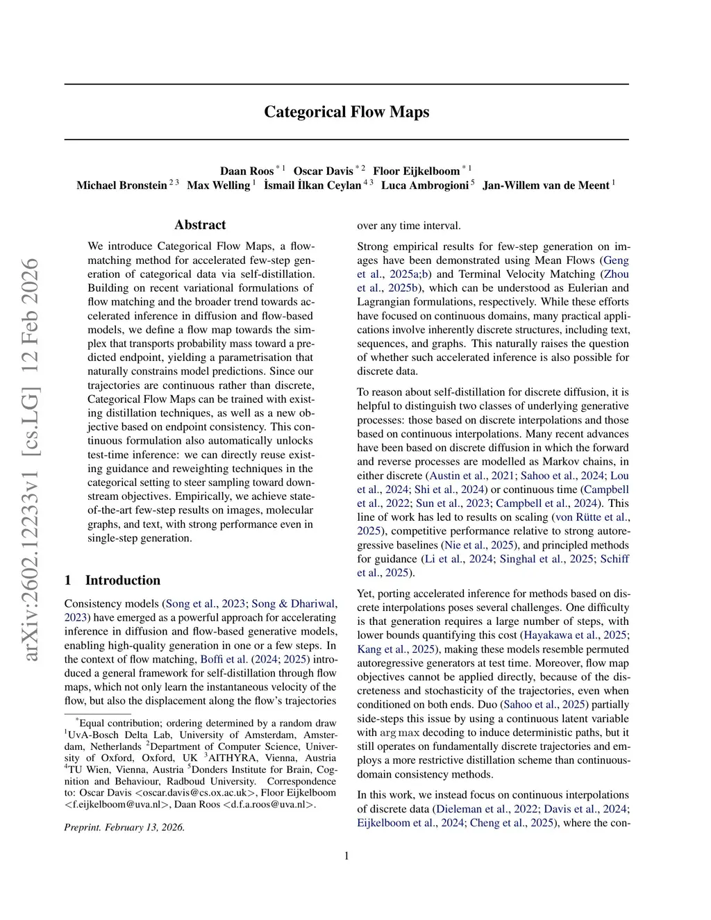 We introduce Categorical Flow Maps, a flow-matching method for accelerated few-step generation of categorical data via self-distillation. Building on recent variational formulations of flow matching and the broader trend towards accelerated inference in diffusion and flow-based models, we define a flow map towards the simplex that transports probability mass toward a predicted endpoint, yielding a parametrisation that naturally constrains model predictions. Since our trajectories are continuous rather than discrete, Categorical Flow Maps can be trained with existing distillation techniques, as well as a new objective based on endpoint consistency. This continuous formulation also automatically unlocks test-time inference: we can directly reuse existing guidance and reweighting techniques in the categorical setting to steer sampling toward downstream objectives. Empirically, we achieve state-of-the-art few-step results on images, molecular graphs, and text, with strong performance even in single-step generation.