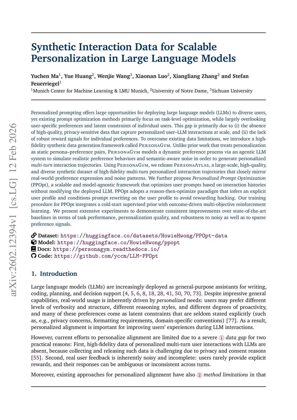 Personalized prompting offers large opportunities for deploying large language models (LLMs) to diverse users, yet existing prompt optimization methods primarily focus on task-level optimization while largely overlooking user-specific preferences and latent constraints of individual users. This gap is primarily due to (i) the absence of high-quality, privacy-sensitive data that capture personalized user-LLM interactions at scale, and (ii) the lack of robust reward signals for individual preferences. To overcome existing data limitations, we introduce a high-fidelity synthetic data generation framework called PersonaGym. Unlike prior work that treats personalization as static persona-preference pairs, PersonaGym models a dynamic preference process via an agentic LLM system to simulate realistic preference behaviors and semantic-aware noise in order to generate personalized multi-turn interaction trajectories. Using PersonaGym, we release PersonaAtlas, a large-scale, high-quality, and diverse synthetic dataset of high-fidelity multi-turn personalized interaction trajectories that closely mirror real-world preference expression and noise patterns. We further propose Personalized Prompt Optimization (PPOpt), a scalable and model-agnostic framework that optimizes user prompts based on interaction histories without modifying the deployed LLM. PPOpt adopts a reason-then-optimize paradigm that infers an explicit user profile and conditions prompt rewriting on the user profile to avoid reward hacking. Our training procedure for PPOpt integrates a cold-start supervised prior with outcome-driven multi-objective reinforcement learning. We present extensive experiments to demonstrate consistent improvements over state-of-the-art baselines in terms of task performance, personalization quality, and robustness to noisy as well as to sparse preference signals.