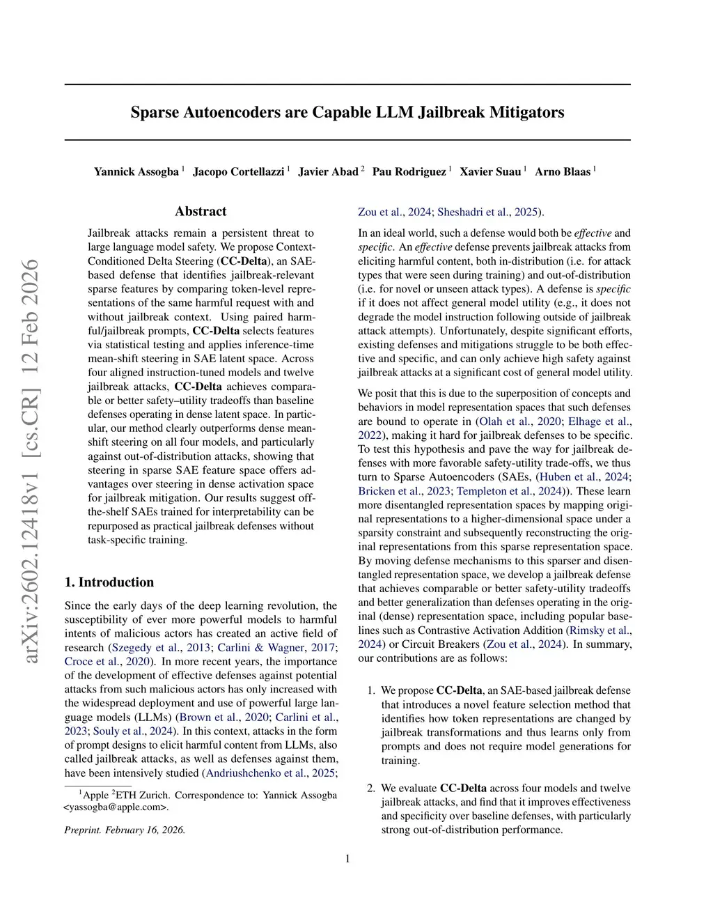 Jailbreak attacks remain a persistent threat to large language model safety. We propose Context-Conditioned Delta Steering (CC-Delta), an SAE-based defense that identifies jailbreak-relevant sparse features by comparing token-level representations of the same harmful request with and without jailbreak context. Using paired harmful/jailbreak prompts, CC-Delta selects features via statistical testing and applies inference-time mean-shift steering in SAE latent space. Across four aligned instruction-tuned models and twelve jailbreak attacks, CC-Delta achieves comparable or better safety-utility tradeoffs than baseline defenses operating in dense latent space. In particular, our method clearly outperforms dense mean-shift steering on all four models, and particularly against out-of-distribution attacks, showing that steering in sparse SAE feature space offers advantages over steering in dense activation space for jailbreak mitigation. Our results suggest off-the-shelf SAEs trained for interpretability can be repurposed as practical jailbreak defenses without task-specific training.