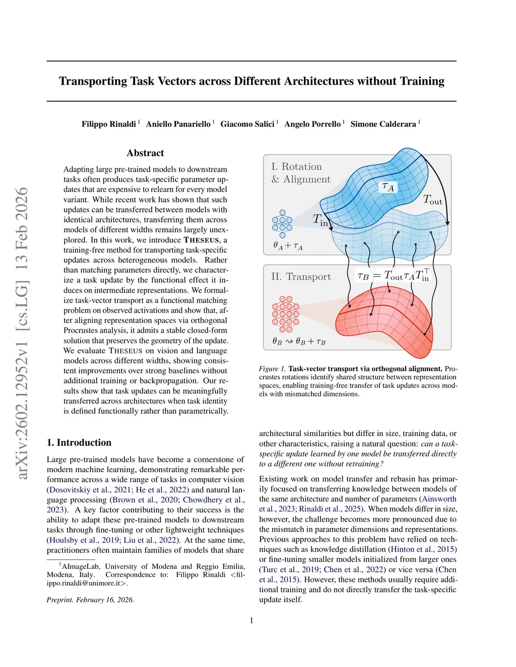 Adapting large pre-trained models to downstream tasks often produces task-specific parameter updates that are expensive to relearn for every model variant. While recent work has shown that such updates can be transferred between models with identical architectures, transferring them across models of different widths remains largely unexplored. In this work, we introduce Theseus, a training-free method for transporting task-specific updates across heterogeneous models. Rather than matching parameters directly, we characterize a task update by the functional effect it induces on intermediate representations. We formalize task-vector transport as a functional matching problem on observed activations and show that, after aligning representation spaces via orthogonal Procrustes analysis, it admits a stable closed-form solution that preserves the geometry of the update. We evaluate Theseus on vision and language models across different widths, showing consistent improvements over strong baselines without additional training or backpropagation. Our results show that task updates can be meaningfully transferred across architectures when task identity is defined functionally rather than parametrically.