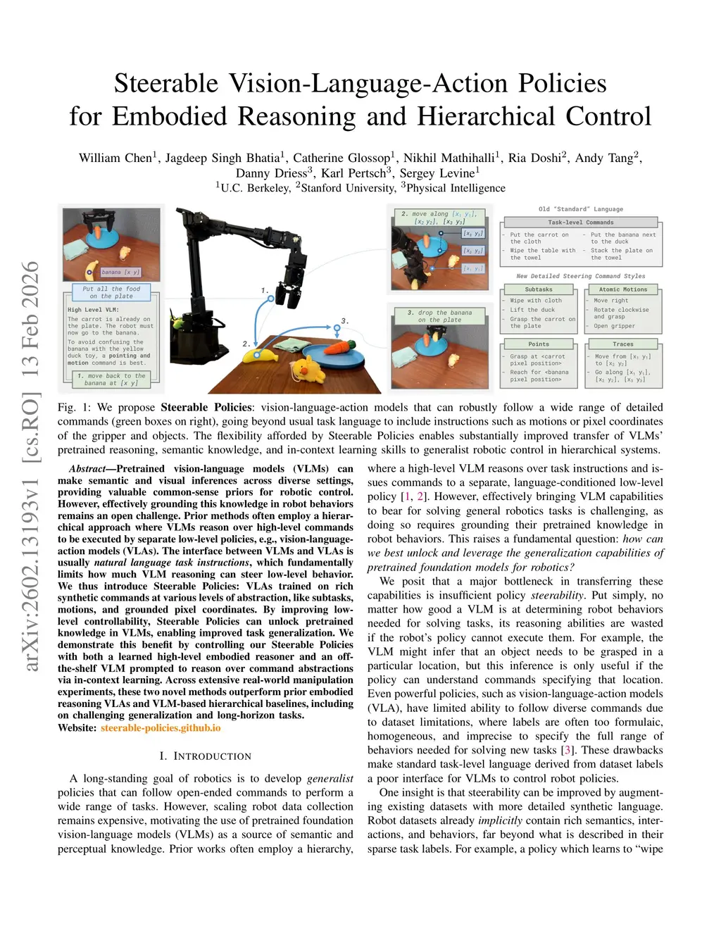 Pretrained vision-language models (VLMs) can make semantic and visual inferences across diverse settings, providing valuable common-sense priors for robotic control. However, effectively grounding this knowledge in robot behaviors remains an open challenge. Prior methods often employ a hierarchical approach where VLMs reason over high-level commands to be executed by separate low-level policies, e.g., vision-language-action models (VLAs). The interface between VLMs and VLAs is usually natural language task instructions, which fundamentally limits how much VLM reasoning can steer low-level behavior. We thus introduce Steerable Policies: VLAs trained on rich synthetic commands at various levels of abstraction, like subtasks, motions, and grounded pixel coordinates. By improving low-level controllability, Steerable Policies can unlock pretrained knowledge in VLMs, enabling improved task generalization. We demonstrate this benefit by controlling our Steerable Policies with both a learned high-level embodied reasoner and an off-the-shelf VLM prompted to reason over command abstractions via in-context learning. Across extensive real-world manipulation experiments, these two novel methods outperform prior embodied reasoning VLAs and VLM-based hierarchical baselines, including on challenging generalization and long-horizon tasks.Website:this http URL