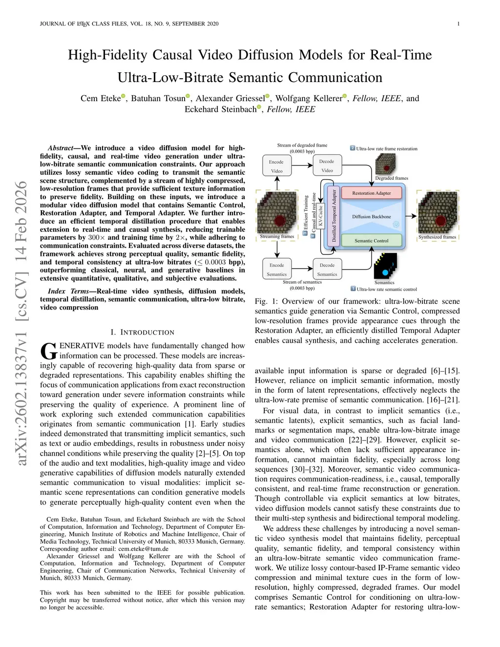 We introduce a video diffusion model for high-fidelity, causal, and real-time video generation under ultra-low-bitrate semantic communication constraints. Our approach utilizes lossy semantic video coding to transmit the semantic scene structure, complemented by a stream of highly compressed, low-resolution frames that provide sufficient texture information to preserve fidelity. Building on these inputs, we introduce a modular video diffusion model that contains Semantic Control, Restoration Adapter, and Temporal Adapter. We further introduce an efficient temporal distillation procedure that enables extension to real-time and causal synthesis, reducing trainable parameters by 300x and training time by 2x, while adhering to communication constraints. Evaluated across diverse datasets, the framework achieves strong perceptual quality, semantic fidelity, and temporal consistency at ultra-low bitrates (< 0.0003 bpp), outperforming classical, neural, and generative baselines in extensive quantitative, qualitative, and subjective evaluations.