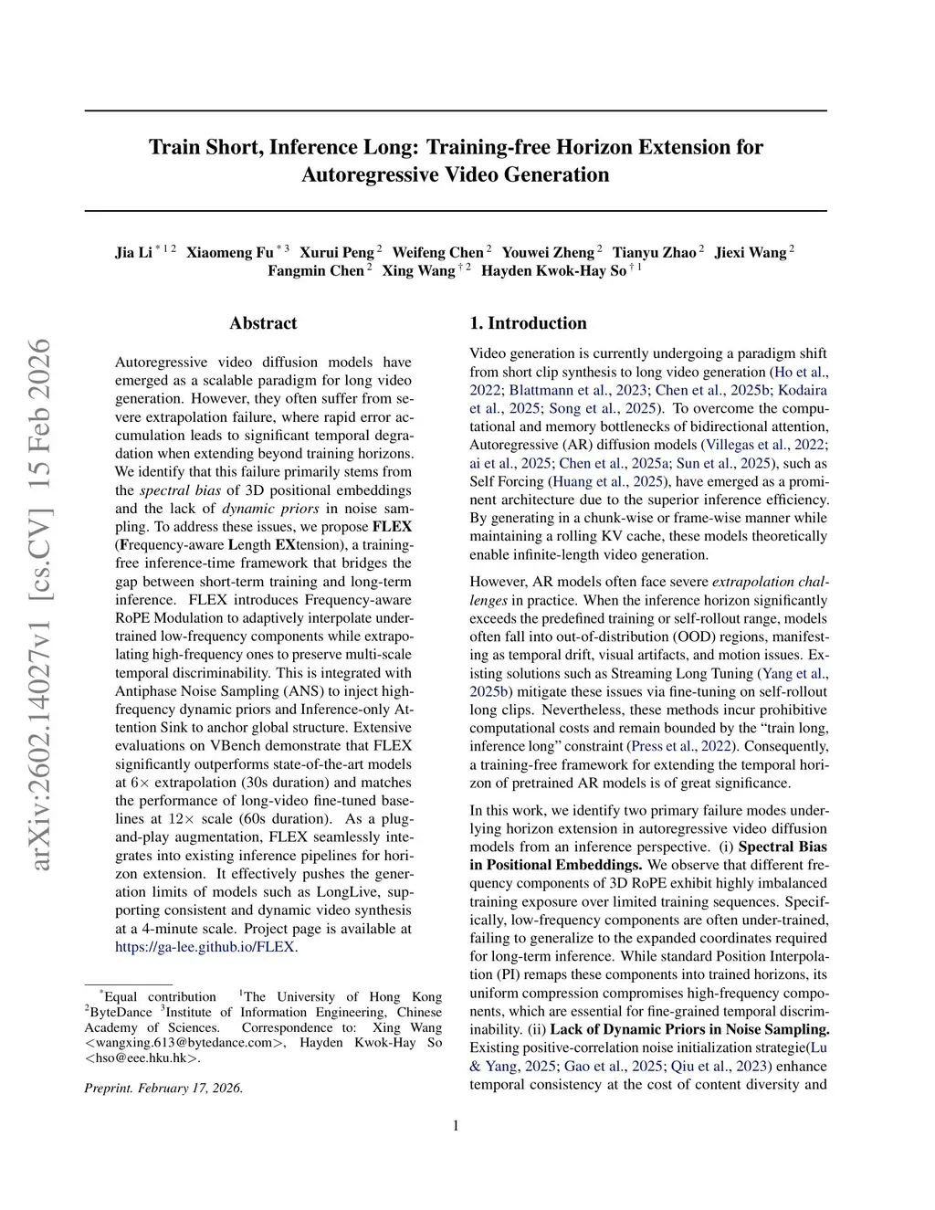 Autoregressive video diffusion models have emerged as a scalable paradigm for long video generation. However, they often suffer from severe extrapolation failure, where rapid error accumulation leads to significant temporal degradation when extending beyond training horizons. We identify that this failure primarily stems from the spectral bias of 3D positional embeddings and the lack of dynamic priors in noise sampling. To address these issues, we propose FLEX (Frequency-aware Length EXtension), a training-free inference-time framework that bridges the gap between short-term training and long-term inference. FLEX introduces Frequency-aware RoPE Modulation to adaptively interpolate under-trained low-frequency components while extrapolating high-frequency ones to preserve multi-scale temporal discriminability. This is integrated with Antiphase Noise Sampling (ANS) to inject high-frequency dynamic priors and Inference-only Attention Sink to anchor global structure. Extensive evaluations on VBench demonstrate that FLEX significantly outperforms state-of-the-art models at 6x extrapolation (30s duration) and matches the performance of long-video fine-tuned baselines at 12x scale (60s duration). As a plug-and-play augmentation, FLEX seamlessly integrates into existing inference pipelines for horizon extension. It effectively pushes the generation limits of models such as LongLive, supporting consistent and dynamic video synthesis at a 4-minute scale. Project page is available atthis https URL.