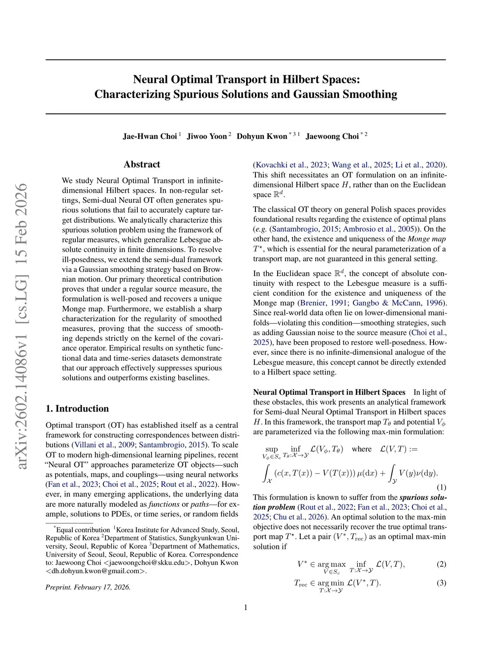 Neural Optimal Transport in Hilbert Spaces: Characterizing Spurious Solutions and Gaussian Smoothing