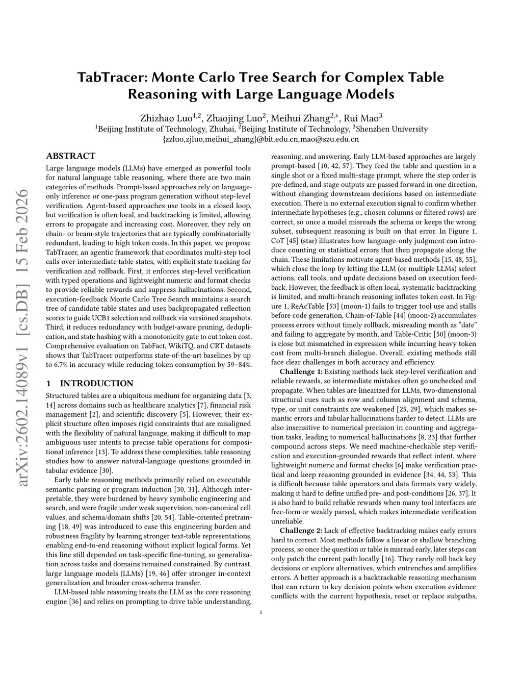 Large language models (LLMs) have emerged as powerful tools for natural language table reasoning, where there are two main categories of methods. Prompt-based approaches rely on language-only inference or one-pass program generation without step-level verification. Agent-based approaches use tools in a closed loop, but verification is often local and backtracking is limited, allowing errors to propagate and increasing cost. Moreover, they rely on chain- or beam-style trajectories that are typically combinatorially redundant, leading to high token costs. In this paper, we propose TabTracer, an agentic framework that coordinates multi-step tool calls over intermediate table states, with explicit state tracking for verification and rollback. First, it enforces step-level verification with typed operations and lightweight numeric and format checks to provide reliable rewards and suppress hallucinations. Second, execution-feedback Monte Carlo Tree Search maintains a search tree of candidate table states and uses backpropagated reflection scores to guide UCB1 selection and rollback via versioned snapshots. Third, it reduces redundancy with budget-aware pruning, deduplication, and state hashing with a monotonicity gate to cut token cost. Comprehensive evaluation on TabFact, WikiTQ, and CRT datasets shows that TabTracer outperforms state-of-the-art baselines by up to 6.7% in accuracy while reducing token consumption by 59--84%.