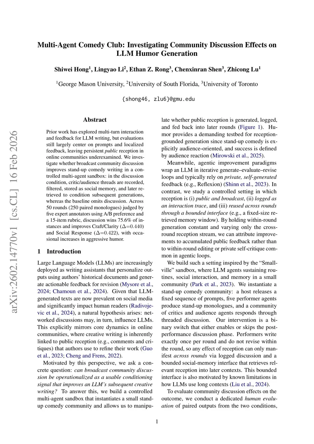 Prior work has explored multi-turn interaction and feedback for LLM writing, but evaluations still largely center on prompts and localized feedback, leaving persistent public reception in online communities underexamined. We test whether broadcast community discussion improves stand-up comedy writing in a controlled multi-agent sandbox: in the discussion condition, critic and audience threads are recorded, filtered, stored as social memory, and later retrieved to condition subsequent generations, whereas the baseline omits discussion. Across 50 rounds (250 paired monologues) judged by five expert annotators using A/B preference and a 15-item rubric, discussion wins 75.6% of instances and improves Craft/Clarity ({\Delta} = 0.440) and Social Response ({\Delta} = 0.422), with occasional increases in aggressive humor.