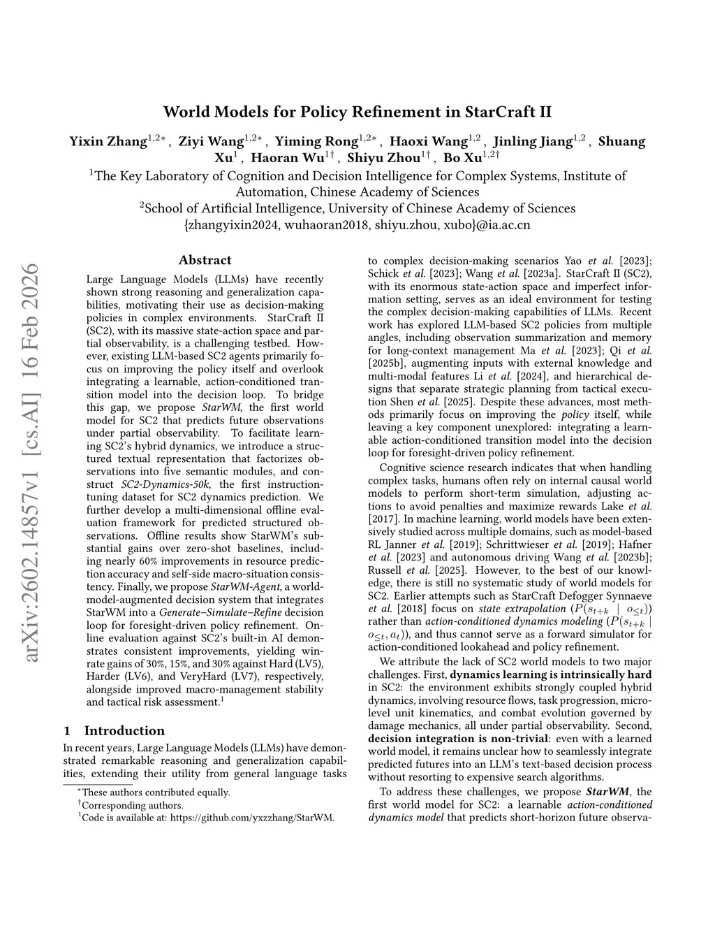 Large Language Models (LLMs) have recently shown strong reasoning and generalization capabilities, motivating their use as decision-making policies in complex environments. StarCraft II (SC2), with its massive state-action space and partial observability, is a challenging testbed. However, existing LLM-based SC2 agents primarily focus on improving the policy itself and overlook integrating a learnable, action-conditioned transition model into the decision loop. To bridge this gap, we propose StarWM, the first world model for SC2 that predicts future observations under partial observability. To facilitate learning SC2's hybrid dynamics, we introduce a structured textual representation that factorizes observations into five semantic modules, and construct SC2-Dynamics-50k, the first instruction-tuning dataset for SC2 dynamics prediction. We further develop a multi-dimensional offline evaluation framework for predicted structured observations. Offline results show StarWM's substantial gains over zero-shot baselines, including nearly 60% improvements in resource prediction accuracy and self-side macro-situation consistency. Finally, we propose StarWM-Agent, a world-model-augmented decision system that integrates StarWM into a Generate--Simulate--Refine decision loop for foresight-driven policy refinement. Online evaluation against SC2's built-in AI demonstrates consistent improvements, yielding win-rate gains of 30%, 15%, and 30% against Hard (LV5), Harder (LV6), and VeryHard (LV7), respectively, alongside improved macro-management stability and tactical risk assessment.