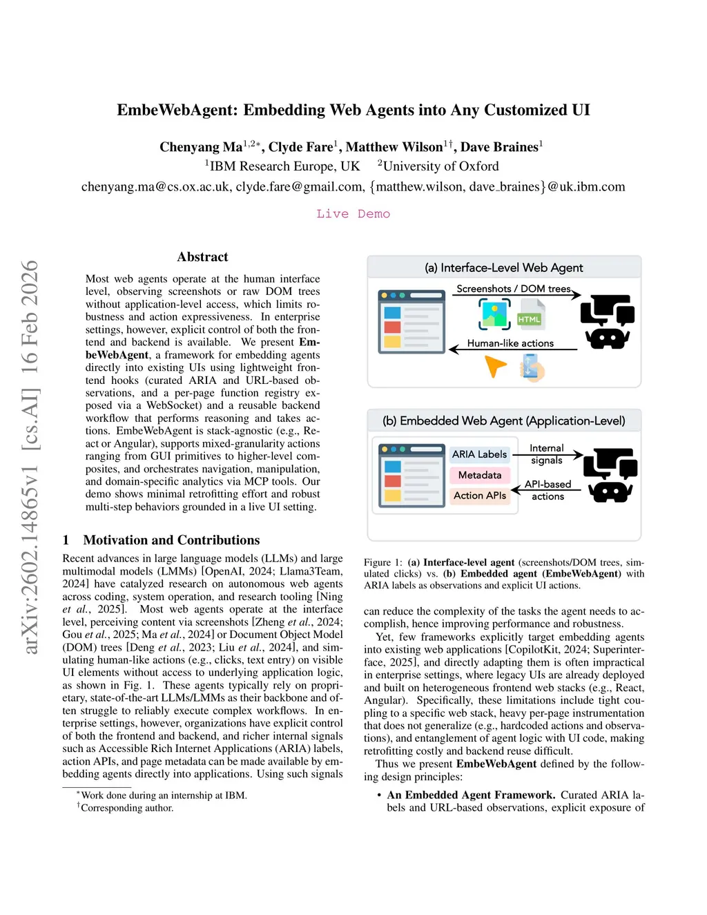 Most web agents operate at the human interface level, observing screenshots or raw DOM trees without application-level access, which limits robustness and action expressiveness. In enterprise settings, however, explicit control of both the frontend and backend is available. We present EmbeWebAgent, a framework for embedding agents directly into existing UIs using lightweight frontend hooks (curated ARIA and URL-based observations, and a per-page function registry exposed via a WebSocket) and a reusable backend workflow that performs reasoning and takes actions. EmbeWebAgent is stack-agnostic (e.g., React or Angular), supports mixed-granularity actions ranging from GUI primitives to higher-level composites, and orchestrates navigation, manipulation, and domain-specific analytics via MCP tools. Our demo shows minimal retrofitting effort and robust multi-step behaviors grounded in a live UI setting. Live Demo:this https URL