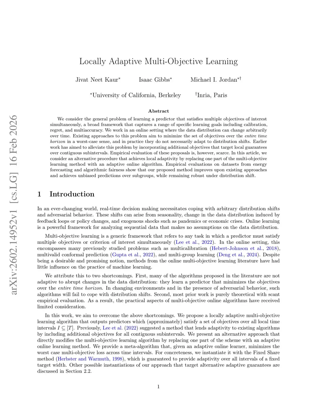 We consider the general problem of learning a predictor that satisfies multiple objectives of interest simultaneously, a broad framework that captures a range of specific learning goals including calibration, regret, and multiaccuracy. We work in an online setting where the data distribution can change arbitrarily over time. Existing approaches to this problem aim to minimize the set of objectives over the entire time horizon in a worst-case sense, and in practice they do not necessarily adapt to distribution shifts. Earlier work has aimed to alleviate this problem by incorporating additional objectives that target local guarantees over contiguous subintervals. Empirical evaluation of these proposals is, however, scarce. In this article, we consider an alternative procedure that achieves local adaptivity by replacing one part of the multi-objective learning method with an adaptive online algorithm. Empirical evaluations on datasets from energy forecasting and algorithmic fairness show that our proposed method improves upon existing approaches and achieves unbiased predictions over subgroups, while remaining robust under distribution shift.