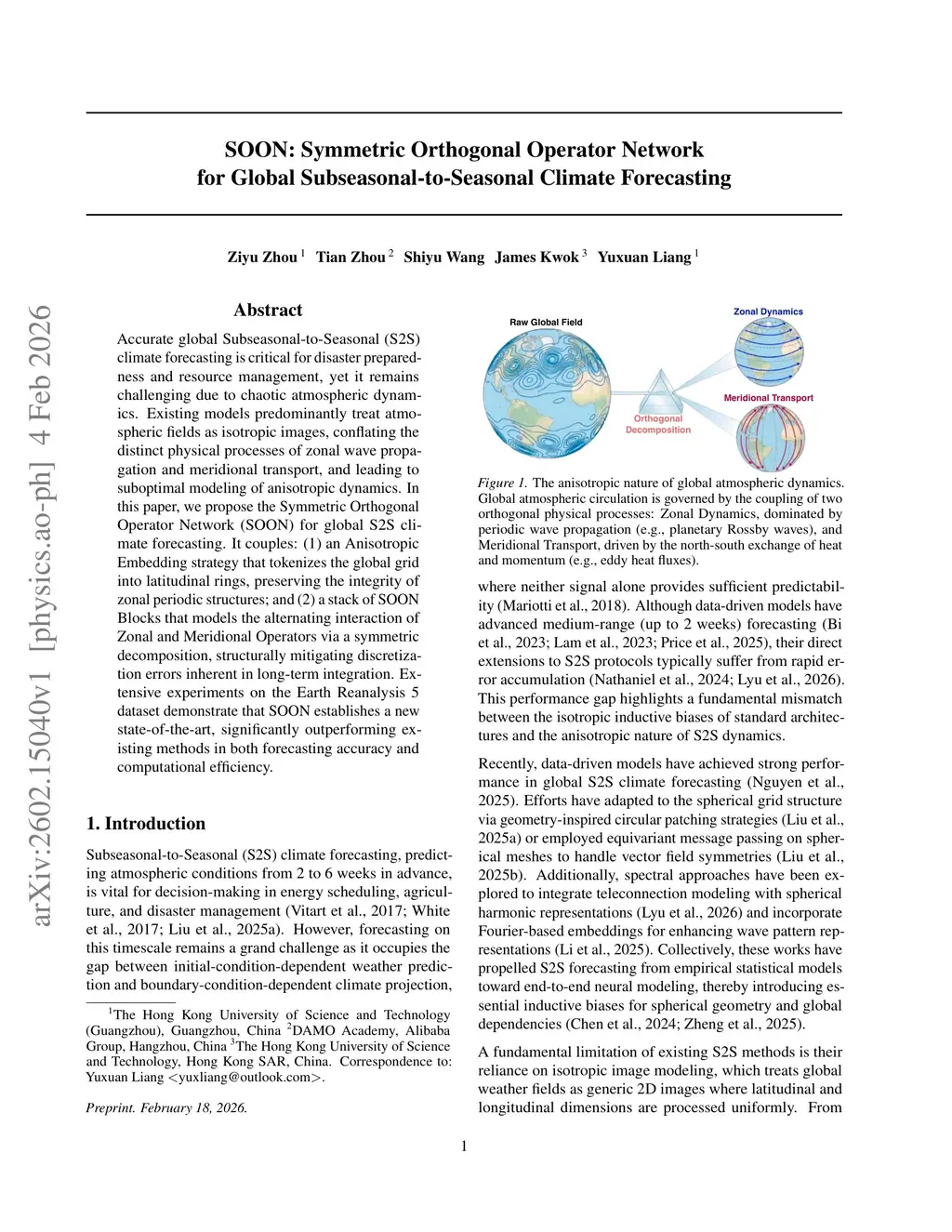 Accurate global Subseasonal-to-Seasonal (S2S) climate forecasting is critical for disaster preparedness and resource management, yet it remains challenging due to chaotic atmospheric dynamics. Existing models predominantly treat atmospheric fields as isotropic images, conflating the distinct physical processes of zonal wave propagation and meridional transport, and leading to suboptimal modeling of anisotropic dynamics. In this paper, we propose the Symmetric Orthogonal Operator Network (SOON) for global S2S climate forecasting. It couples: (1) an Anisotropic Embedding strategy that tokenizes the global grid into latitudinal rings, preserving the integrity of zonal periodic structures; and (2) a stack of SOON Blocks that models the alternating interaction of Zonal and Meridional Operators via a symmetric decomposition, structurally mitigating discretization errors inherent in long-term integration. Extensive experiments on the Earth Reanalysis 5 dataset demonstrate that SOON establishes a new state-of-the-art, significantly outperforming existing methods in both forecasting accuracy and computational efficiency.