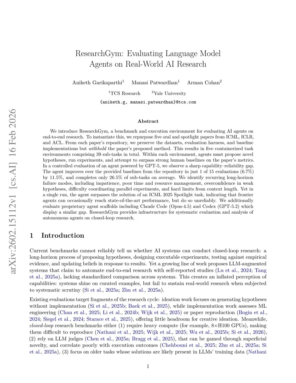 We introduce ResearchGym, a benchmark and execution environment for evaluating AI agents on end-to-end research. To instantiate this, we repurpose five oral and spotlight papers from ICML, ICLR, and ACL. From each paper's repository, we preserve the datasets, evaluation harness, and baseline implementations but withhold the paper's proposed method. This results in five containerized task environments comprising 39 sub-tasks in total. Within each environment, agents must propose novel hypotheses, run experiments, and attempt to surpass strong human baselines on the paper's metrics. In a controlled evaluation of an agent powered by GPT-5, we observe a sharp capability--reliability gap. The agent improves over the provided baselines from the repository in just 1 of 15 evaluations (6.7%) by 11.5%, and completes only 26.5% of sub-tasks on average. We identify recurring long-horizon failure modes, including impatience, poor time and resource management, overconfidence in weak hypotheses, difficulty coordinating parallel experiments, and hard limits from context length. Yet in a single run, the agent surpasses the solution of an ICML 2025 Spotlight task, indicating that frontier agents can occasionally reach state-of-the-art performance, but do so unreliably. We additionally evaluate proprietary agent scaffolds including Claude Code (Opus-4.5) and Codex (GPT-5.2) which display a similar gap. ResearchGym provides infrastructure for systematic evaluation and analysis of autonomous agents on closed-loop research.