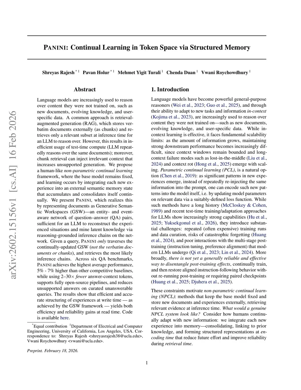 Language models are increasingly used to reason over content they were not trained on, such as new documents, evolving knowledge, and user-specific data. A common approach is retrieval-augmented generation (RAG), which stores verbatim documents externally (as chunks) and retrieves only a relevant subset at inference time for an LLM to reason over. However, this results in inefficient usage of test-time compute (LLM repeatedly reasons over the same documents); moreover, chunk retrieval can inject irrelevant context that increases unsupported generation. We propose a human-like non-parametric continual learning framework, where the base model remains fixed, and learning occurs by integrating each new experience into an external semantic memory state that accumulates and consolidates itself continually. We present Panini, which realizes this by representing documents as Generative Semantic Workspaces (GSW) -- an entity- and event-aware network of question-answer (QA) pairs, sufficient for an LLM to reconstruct the experienced situations and mine latent knowledge via reasoning-grounded inference chains on the network. Given a query, Panini only traverses the continually-updated GSW (not the verbatim documents or chunks), and retrieves the most likely inference chains. Across six QA benchmarks, Panini achieves the highest average performance, 5%-7% higher than other competitive baselines, while using 2-30x fewer answer-context tokens, supports fully open-source pipelines, and reduces unsupported answers on curated unanswerable queries. The results show that efficient and accurate structuring of experiences at write time -- as achieved by the GSW framework -- yields both efficiency and reliability gains at read time. Code is available atthis https URL.