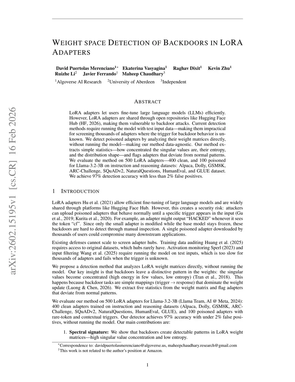 LoRA adapters let users fine-tune large language models (LLMs) efficiently. However, LoRA adapters are shared through open repositories like Hugging Face Hub \citep{huggingface_hub_docs}, making them vulnerable to backdoor attacks. Current detection methods require running the model with test input data -- making them impractical for screening thousands of adapters where the trigger for backdoor behavior is unknown. We detect poisoned adapters by analyzing their weight matrices directly, without running the model -- making our method trigger-agnostic. For each attention projection (Q, K, V, O), our method extracts five spectral statistics from the low-rank update , yielding a 20-dimensional signature for each adapter. A logistic regression detector trained on this representation separates benign and poisoned adapters across three model families -- Llama-3.2-3B~\citep{llama3}, Qwen2.5-3B~\citep{qwen25}, and Gemma-2-2B~\citep{gemma2} -- on unseen test adapters drawn from instruction-following, reasoning, question-answering, code, and classification tasks. Across all three architectures, the detector achieves 100\% accuracy.