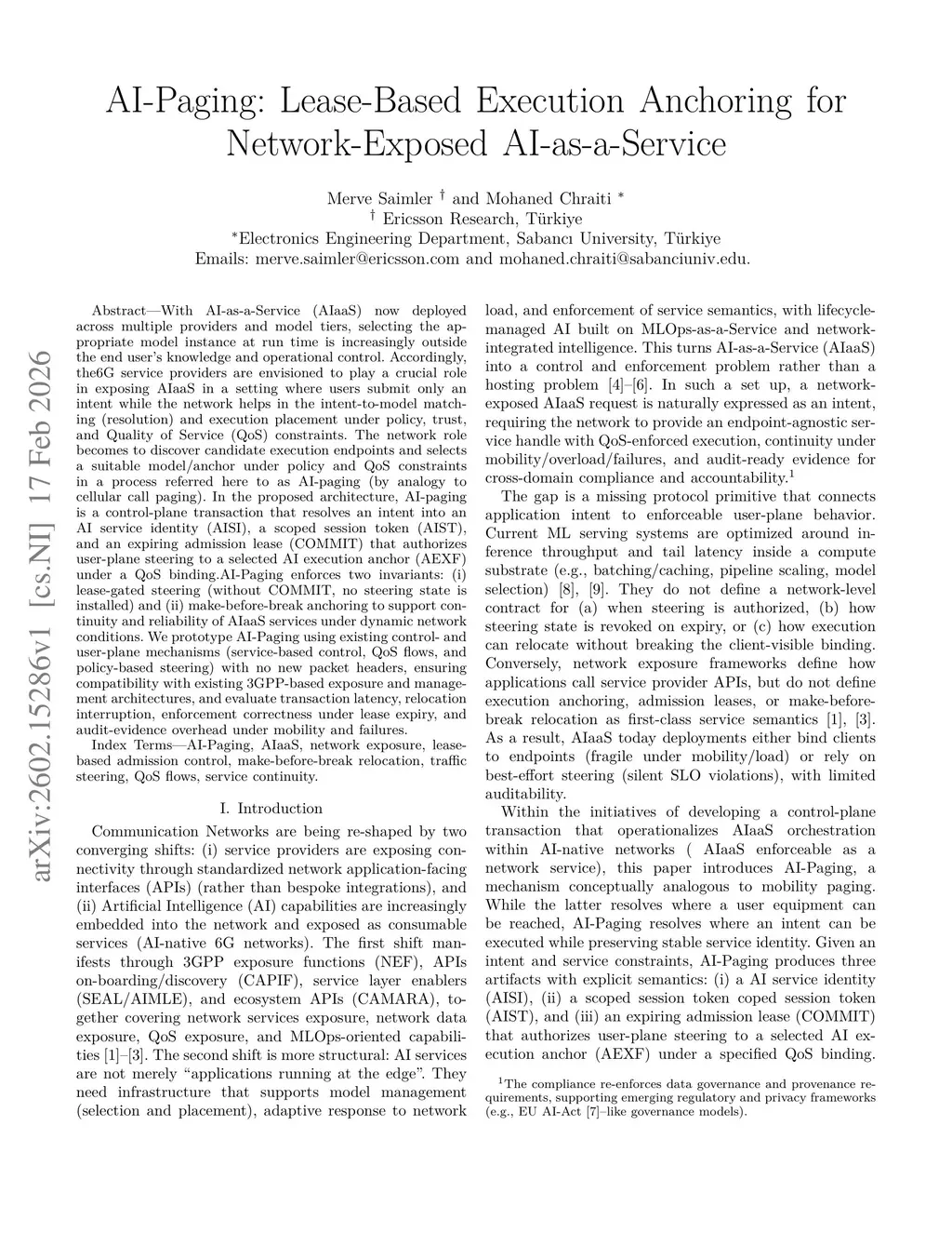 With AI-as-a-Service (AIaaS) now deployed across multiple providers and model tiers, selecting the appropriate model instance at run time is increasingly outside the end user's knowledge and operational control. Accordingly, the 6G service providers are envisioned to play a crucial role in exposing AIaaS in a setting where users submit only an intent while the network helps in the intent-to-model matching (resolution) and execution placement under policy, trust, and Quality of Service (QoS) constraints. The network role becomes to discover candidate execution endpoints and selects a suitable model/anchor under policy and QoS constraints in a process referred here to as AI-paging (by analogy to cellular call paging). In the proposed architecture, AI-paging is a control-plane transaction that resolves an intent into an AI service identity (AISI), a scoped session token (AIST), and an expiring admission lease (COMMIT) that authorizes user-plane steering to a selected AI execution anchor (AEXF) under a QoS binding. AI-Paging enforces two invariants: (i) lease-gated steering (without COMMIT, no steering state is installed) and (ii) make-before-break anchoring to support continuity and reliability of AIaaS services under dynamic network conditions. We prototype AI-Paging using existing control- and user-plane mechanisms (service-based control, QoS flows, and policy-based steering) with no new packet headers, ensuring compatibility with existing 3GPP-based exposure and management architectures, and evaluate transaction latency, relocation interruption, enforcement correctness under lease expiry, and audit-evidence overhead under mobility and failures.