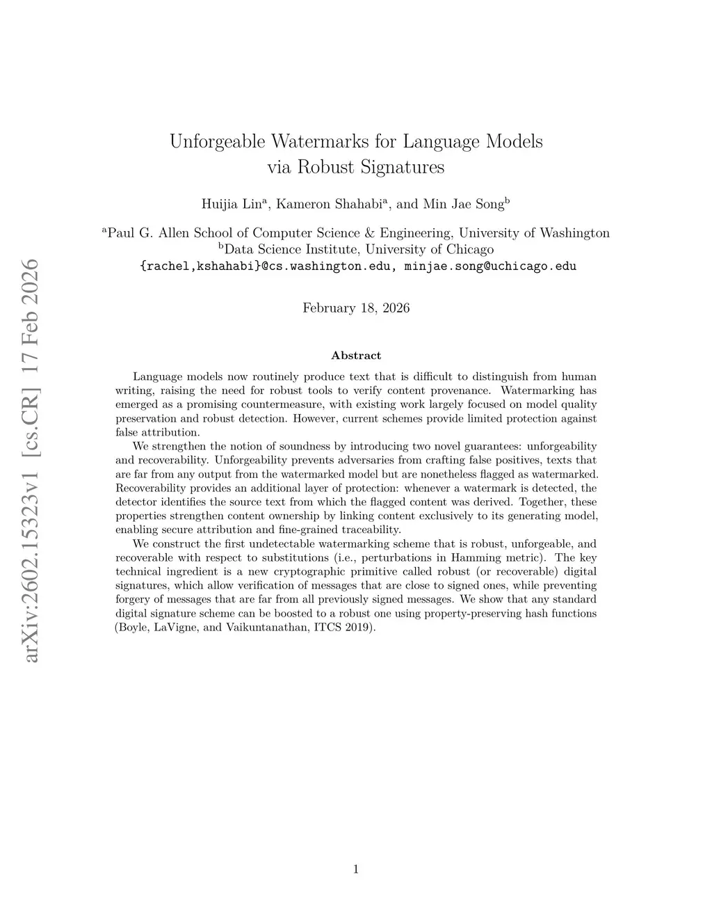 Language models now routinely produce text that is difficult to distinguish from human writing, raising the need for robust tools to verify content provenance. Watermarking has emerged as a promising countermeasure, with existing work largely focused on model quality preservation and robust detection. However, current schemes provide limited protection against false attribution. We strengthen the notion of soundness by introducing two novel guarantees: unforgeability and recoverability. Unforgeability prevents adversaries from crafting false positives, texts that are far from any output from the watermarked model but are nonetheless flagged as watermarked. Recoverability provides an additional layer of protection: whenever a watermark is detected, the detector identifies the source text from which the flagged content was derived. Together, these properties strengthen content ownership by linking content exclusively to its generating model, enabling secure attribution and fine-grained traceability. We construct the first undetectable watermarking scheme that is robust, unforgeable, and recoverable with respect to substitutions (i.e., perturbations in Hamming metric). The key technical ingredient is a new cryptographic primitive called robust (or recoverable) digital signatures, which allow verification of messages that are close to signed ones, while preventing forgery of messages that are far from all previously signed messages. We show that any standard digital signature scheme can be boosted to a robust one using property-preserving hash functions (Boyle, LaVigne, and Vaikuntanathan, ITCS 2019).