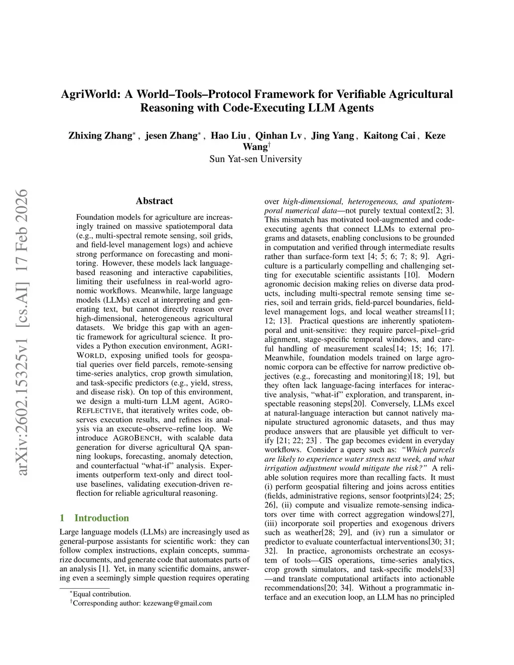 Foundation models for agriculture are increasingly trained on massive spatiotemporal data (e.g., multi-spectral remote sensing, soil grids, and field-level management logs) and achieve strong performance on forecasting and monitoring. However, these models lack language-based reasoning and interactive capabilities, limiting their usefulness in real-world agronomic workflows. Meanwhile, large language models (LLMs) excel at interpreting and generating text, but cannot directly reason over high-dimensional, heterogeneous agricultural datasets. We bridge this gap with an agentic framework for agricultural science. It provides a Python execution environment, AgriWorld, exposing unified tools for geospatial queries over field parcels, remote-sensing time-series analytics, crop growth simulation, and task-specific predictors (e.g., yield, stress, and disease risk). On top of this environment, we design a multi-turn LLM agent, Agro-Reflective, that iteratively writes code, observes execution results, and refines its analysis via an execute-observe-refine loop. We introduce AgroBench, with scalable data generation for diverse agricultural QA spanning lookups, forecasting, anomaly detection, and counterfactual "what-if" analysis. Experiments outperform text-only and direct tool-use baselines, validating execution-driven reflection for reliable agricultural reasoning.