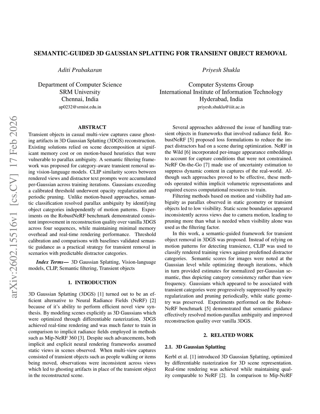 Transient objects in casual multi-view captures cause ghosting artifacts in 3D Gaussian Splatting (3DGS) reconstruction. Existing solutions relied on scene decomposition at significant memory cost or on motion-based heuristics that were vulnerable to parallax ambiguity. A semantic filtering framework was proposed for category-aware transient removal using vision-language models. CLIP similarity scores between rendered views and distractor text prompts were accumulated per-Gaussian across training iterations. Gaussians exceeding a calibrated threshold underwent opacity regularization and periodic pruning. Unlike motion-based approaches, semantic classification resolved parallax ambiguity by identifying object categories independently of motion patterns. Experiments on the RobustNeRF benchmark demonstrated consistent improvement in reconstruction quality over vanilla 3DGS across four sequences, while maintaining minimal memory overhead and real-time rendering performance. Threshold calibration and comparisons with baselines validated semantic guidance as a practical strategy for transient removal in scenarios with predictable distractor categories.