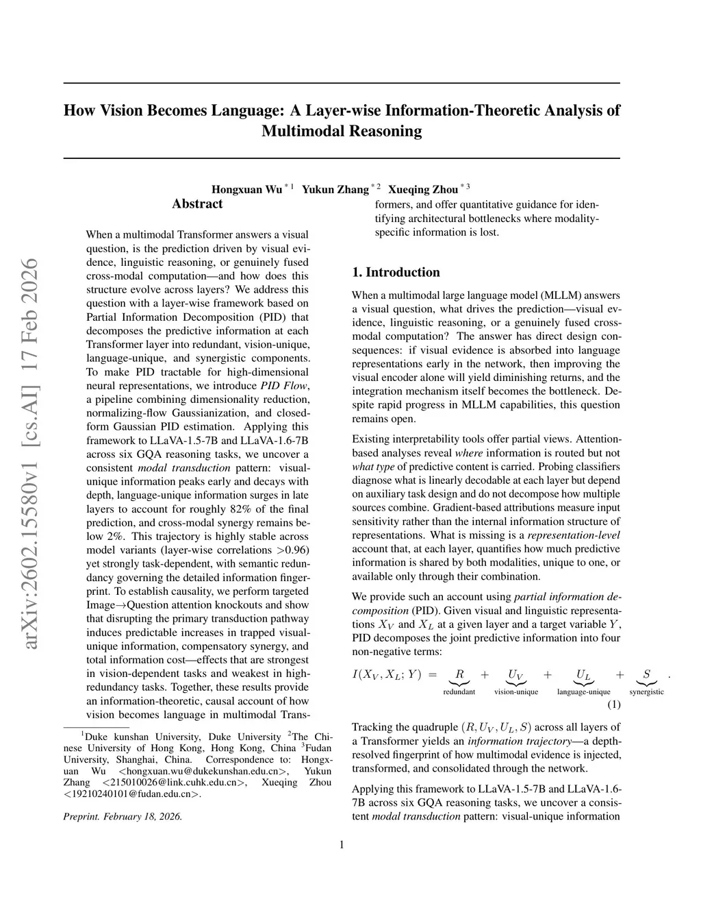 When a multimodal Transformer answers a visual question, is the prediction driven by visual evidence, linguistic reasoning, or genuinely fused cross-modal computation -- and how does this structure evolve across layers? We address this question with a layer-wise framework based on Partial Information Decomposition (PID) that decomposes the predictive information at each Transformer layer into redundant, vision-unique, language-unique, and synergistic components. To make PID tractable for high-dimensional neural representations, we introduce \emph{PID Flow}, a pipeline combining dimensionality reduction, normalizing-flow Gaussianization, and closed-form Gaussian PID estimation. Applying this framework to LLaVA-1.5-7B and LLaVA-1.6-7B across six GQA reasoning tasks, we uncover a consistent \emph{modal transduction} pattern: visual-unique information peaks early and decays with depth, language-unique information surges in late layers to account for roughly 82\% of the final prediction, and cross-modal synergy remains below 2\%. This trajectory is highly stable across model variants (layer-wise correlations 0.96) yet strongly task-dependent, with semantic redundancy governing the detailed information fingerprint. To establish causality, we perform targeted ImageQuestion attention knockouts and show that disrupting the primary transduction pathway induces predictable increases in trapped visual-unique information, compensatory synergy, and total information cost -- effects that are strongest in vision-dependent tasks and weakest in high-redundancy tasks. Together, these results provide an information-theoretic, causal account of how vision becomes language in multimodal Transformers, and offer quantitative guidance for identifying architectural bottlenecks where modality-specific information is lost.