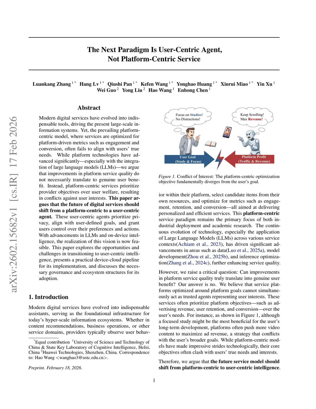 Modern digital services have evolved into indispensable tools, driving the present large-scale information systems. Yet, the prevailing platform-centric model, where services are optimized for platform-driven metrics such as engagement and conversion, often fails to align with users' true needs. While platform technologies have advanced significantly-especially with the integration of large language models (LLMs)-we argue that improvements in platform service quality do not necessarily translate to genuine user benefit. Instead, platform-centric services prioritize provider objectives over user welfare, resulting in conflicts against user interests. This paper argues that the future of digital services should shift from a platform-centric to a user-centric agent. These user-centric agents prioritize privacy, align with user-defined goals, and grant users control over their preferences and actions. With advancements in LLMs and on-device intelligence, the realization of this vision is now feasible. This paper explores the opportunities and challenges in transitioning to user-centric intelligence, presents a practical device-cloud pipeline for its implementation, and discusses the necessary governance and ecosystem structures for its adoption.