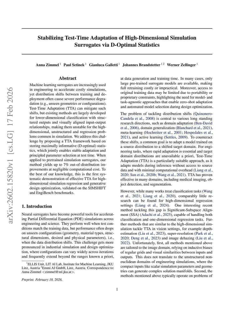 Machine learning surrogates are increasingly used in engineering to accelerate costly simulations, yet distribution shifts between training and deployment often cause severe performance degradation (e.g., unseen geometries or configurations). Test-Time Adaptation (TTA) can mitigate such shifts, but existing methods are largely developed for lower-dimensional classification with structured outputs and visually aligned input-output relationships, making them unstable for the high-dimensional, unstructured and regression problems common in simulation. We address this challenge by proposing a TTA framework based on storing maximally informative (D-optimal) statistics, which jointly enables stable adaptation and principled parameter selection at test time. When applied to pretrained simulation surrogates, our method yields up to 7% out-of-distribution improvements at negligible computational cost. To the best of our knowledge, this is the first systematic demonstration of effective TTA for high-dimensional simulation regression and generative design optimization, validated on the SIMSHIFT and EngiBench benchmarks.