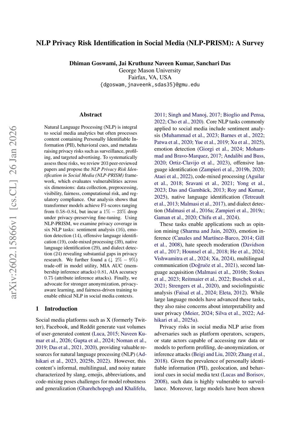 Natural Language Processing (NLP) is integral to social media analytics but often processes content containing Personally Identifiable Information (PII), behavioral cues, and metadata raising privacy risks such as surveillance, profiling, and targeted advertising. To systematically assess these risks, we review 203 peer-reviewed papers and propose the NLP Privacy Risk Identification in Social Media (NLP-PRISM) framework, which evaluates vulnerabilities across six dimensions: data collection, preprocessing, visibility, fairness, computational risk, and regulatory compliance. Our analysis shows that transformer models achieve F1-scores ranging from 0.58-0.84, but incur a 1% - 23% drop under privacy-preserving fine-tuning. Using NLP-PRISM, we examine privacy coverage in six NLP tasks: sentiment analysis (16), emotion detection (14), offensive language identification (19), code-mixed processing (39), native language identification (29), and dialect detection (24) revealing substantial gaps in privacy research. We further found a (reduced by 2% - 9%) trade-off in model utility, MIA AUC (membership inference attacks) 0.81, AIA accuracy 0.75 (attribute inference attacks). Finally, we advocate for stronger anonymization, privacy-aware learning, and fairness-driven training to enable ethical NLP in social media contexts.