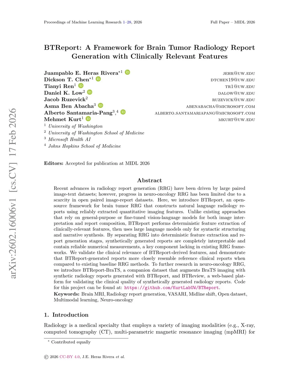 BTReport: A Framework for Brain Tumor Radiology Report Generation with Clinically Relevant Features